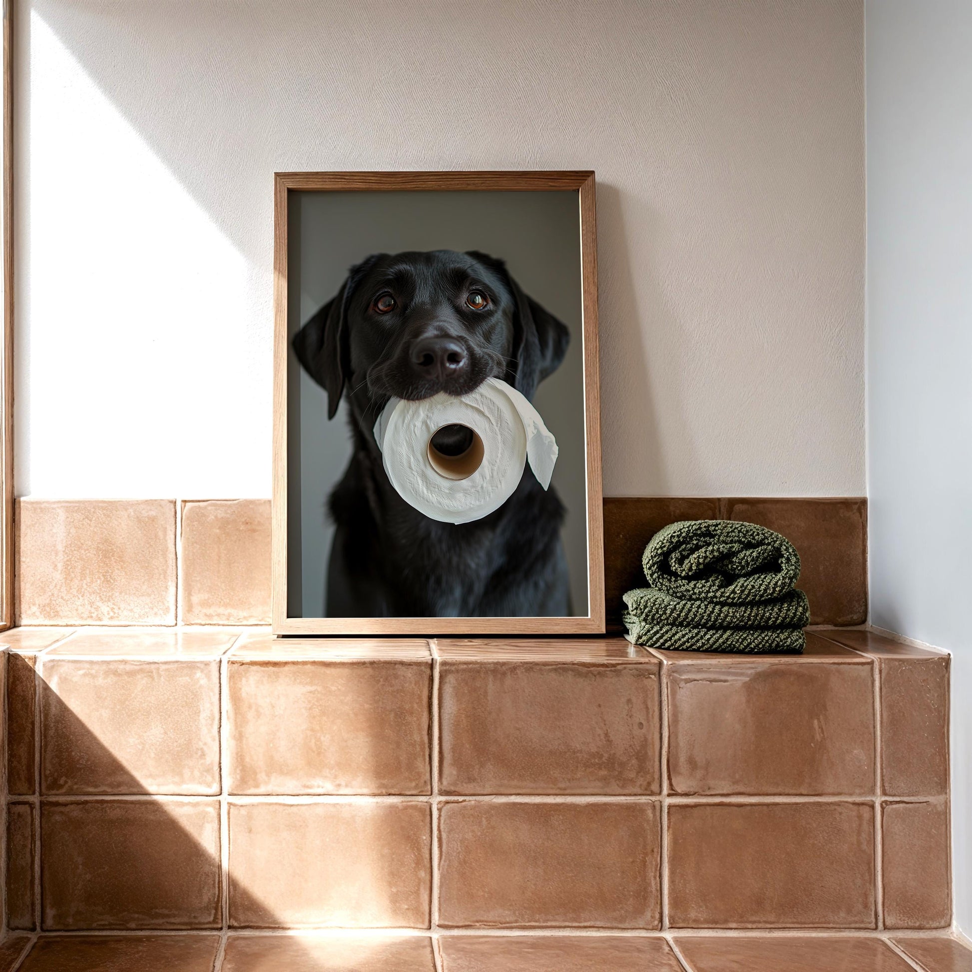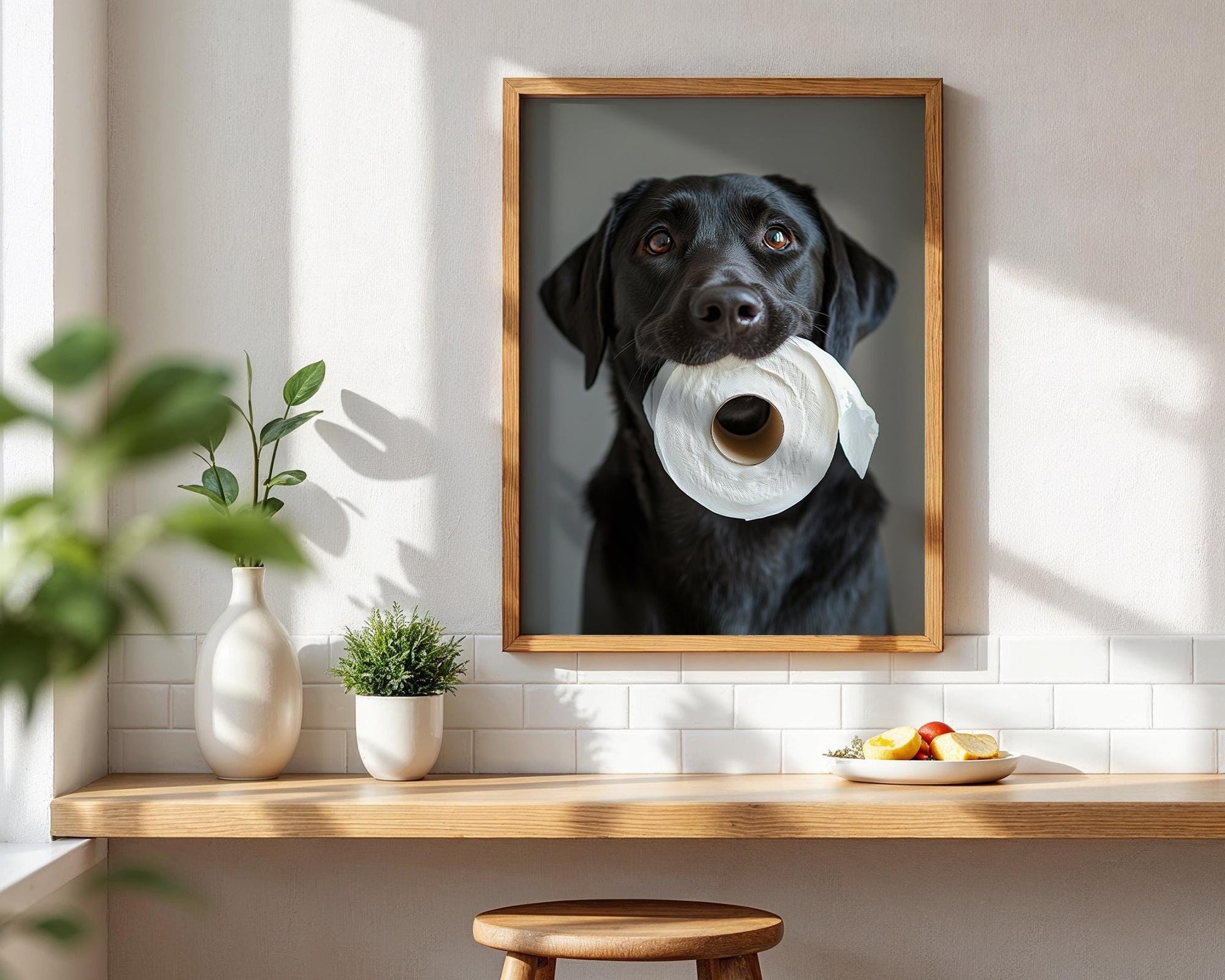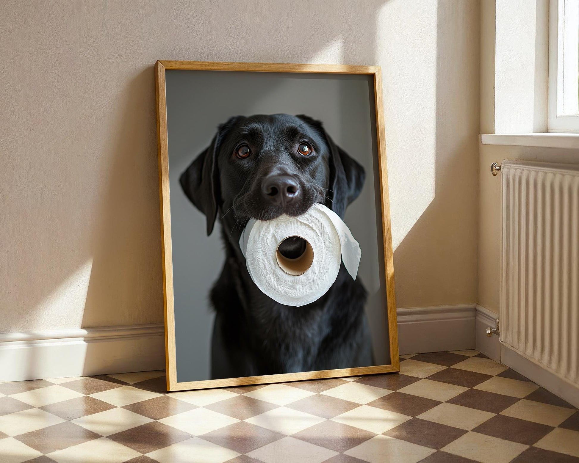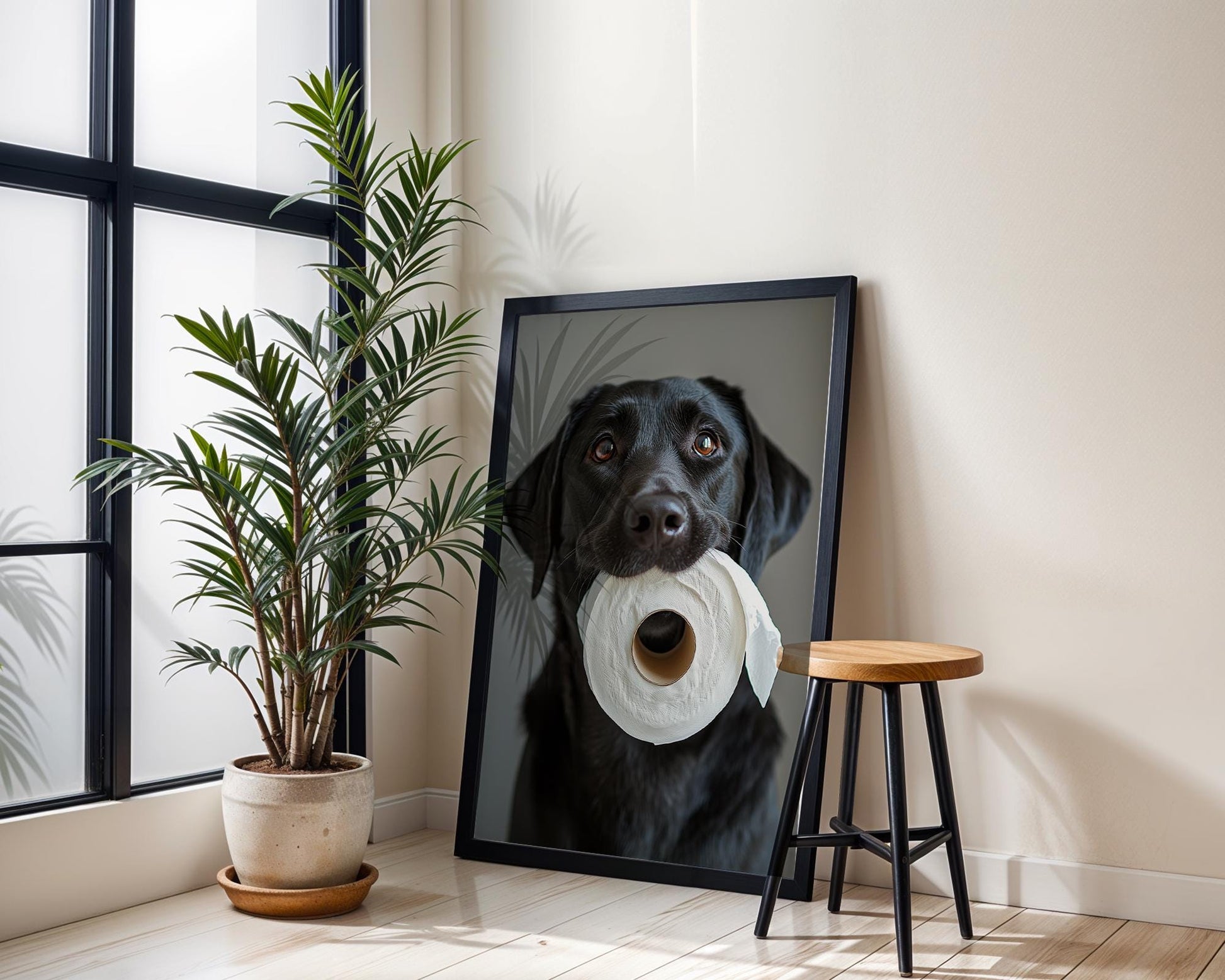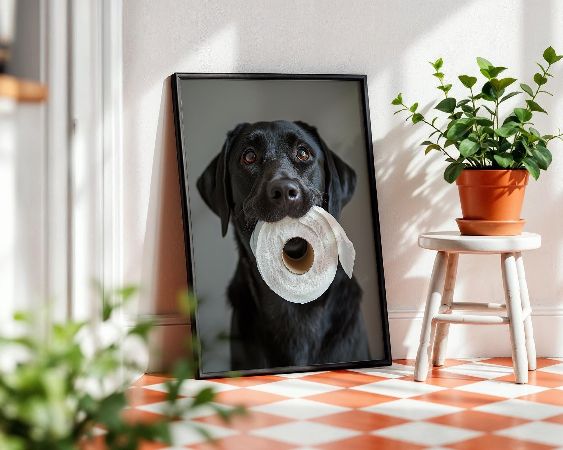 This adorable Black Labrador print features a high-resolution image of a sweet pup holding a roll of toilet paper - a perfect mix of humor, elegance, and canine cuteness! Whether you're decorating a bathroom, laundry room, or pet-themed gallery wall, this unframed print will steal hearts and smiles.