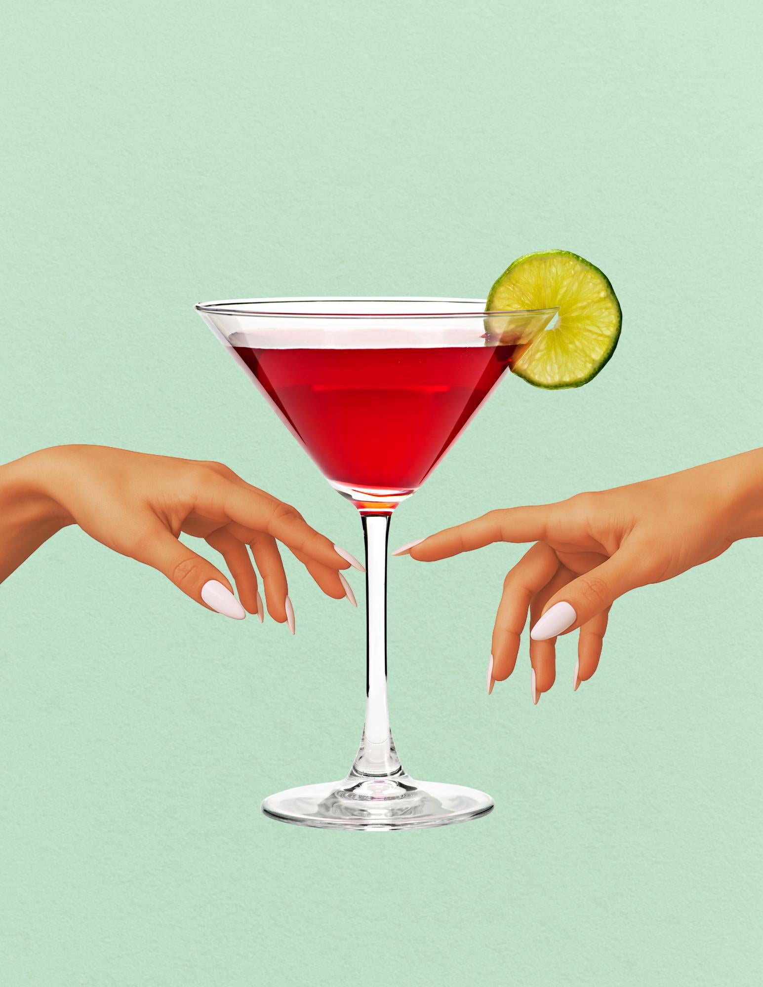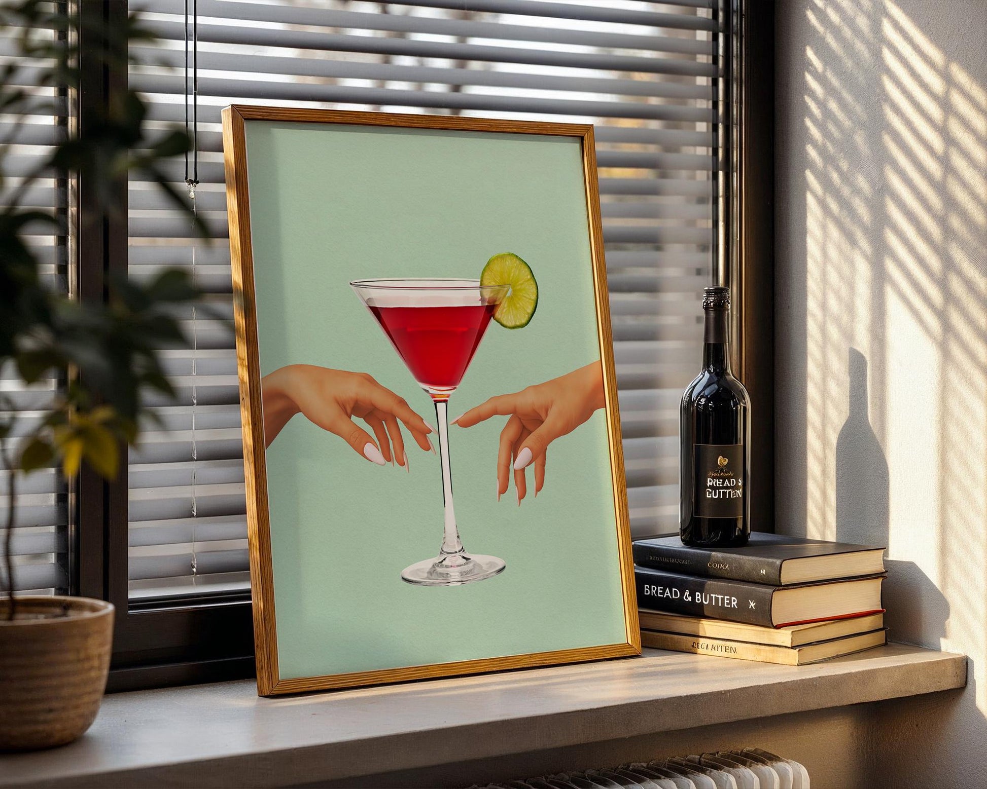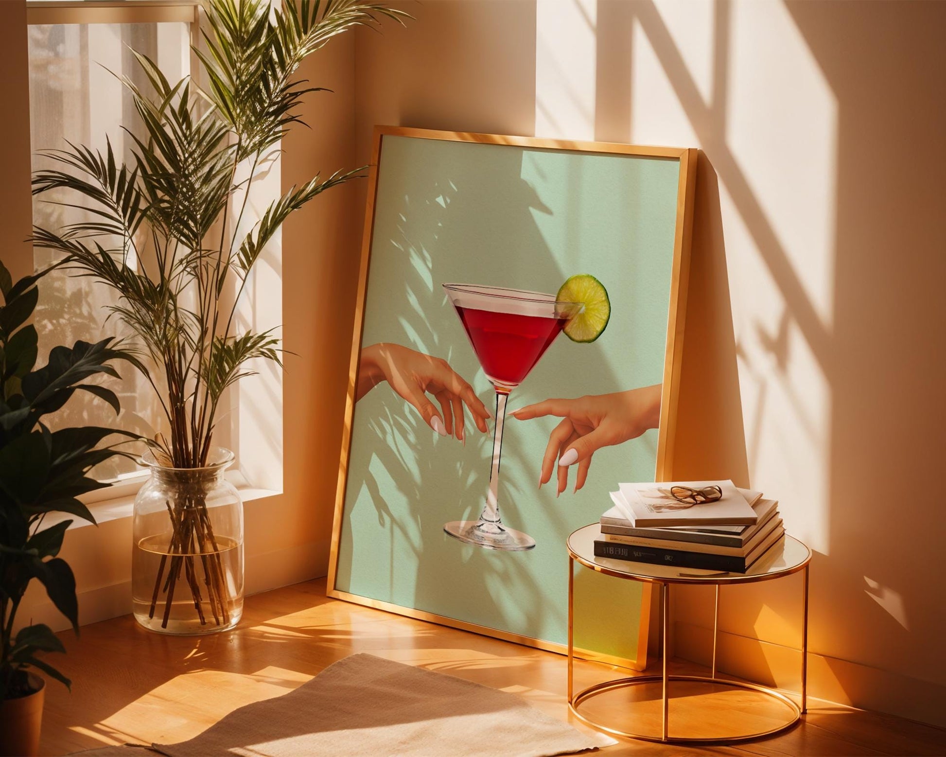 Cosmopolitan Cocktail Wall Art – Modern Feminine Martini Print with Lime, Elegant Hands Aesthetic, Pink Drink Bar Decor, Glam Kitchen Art