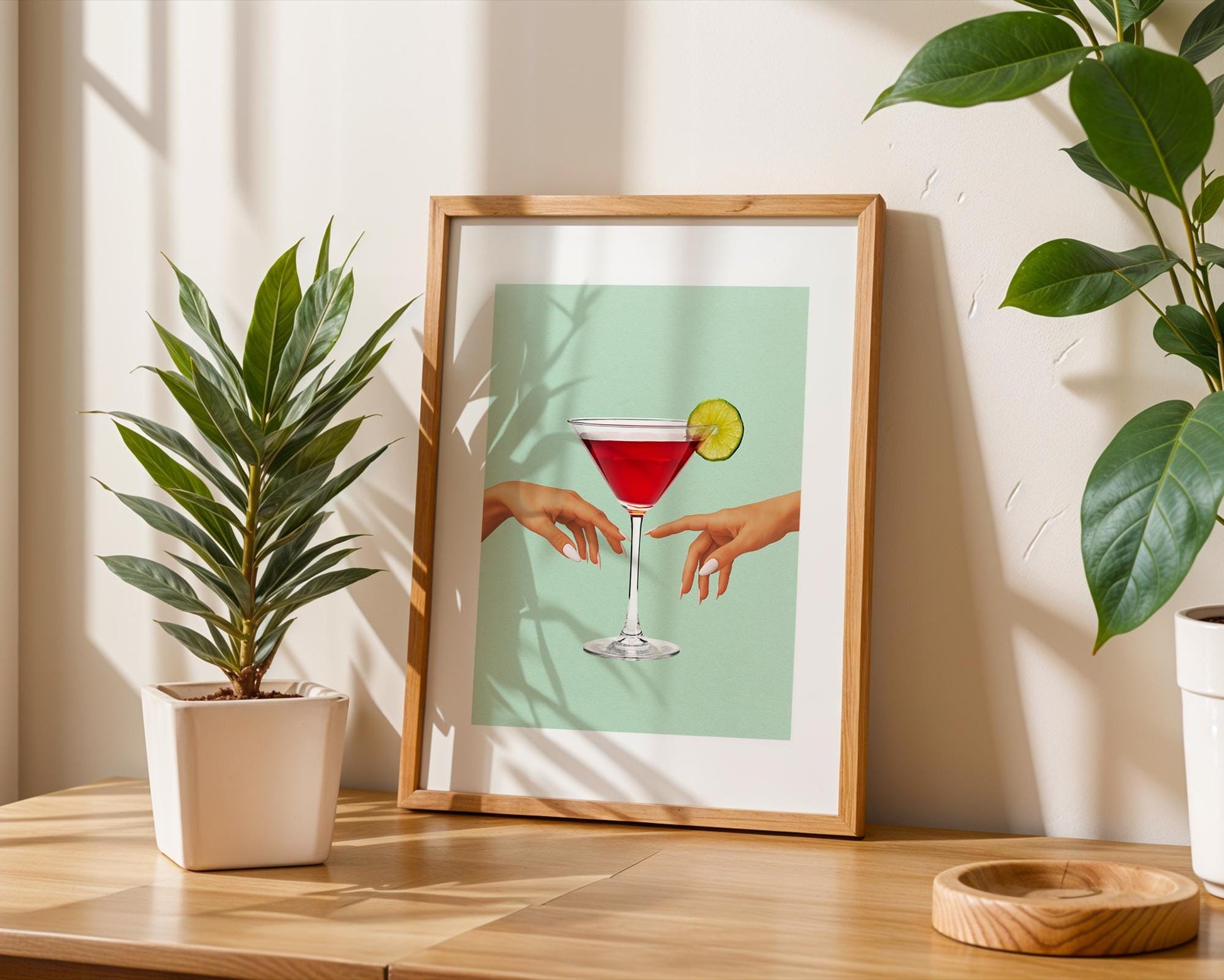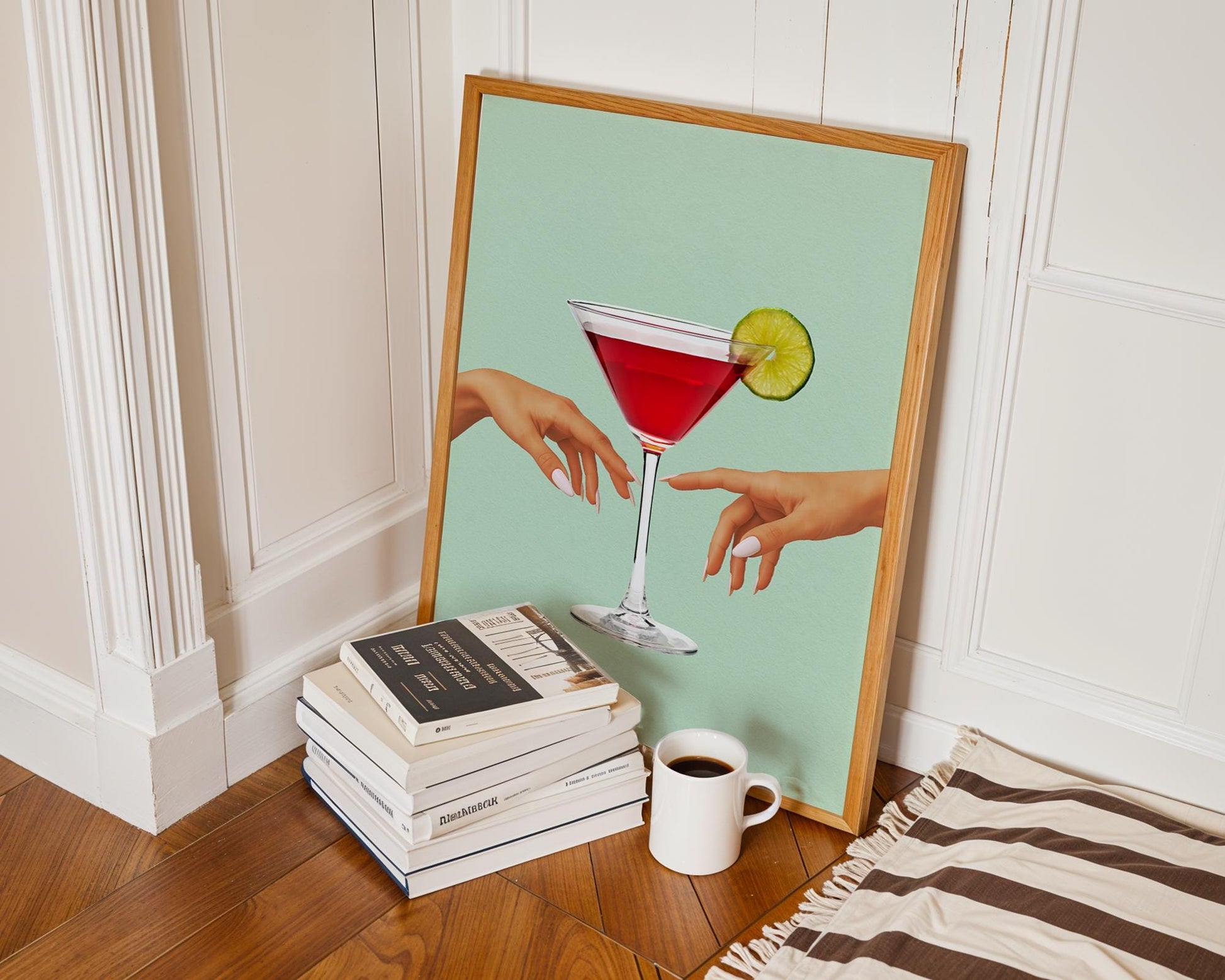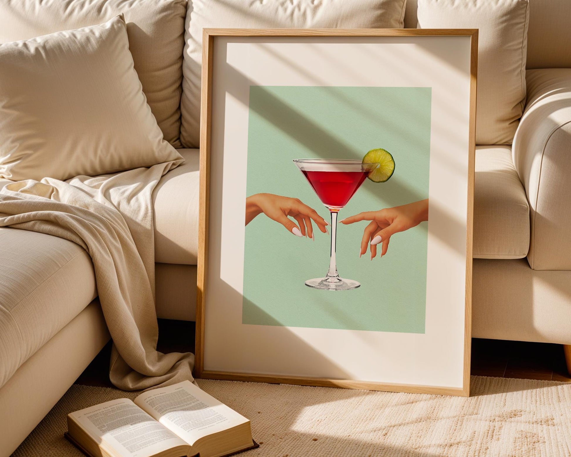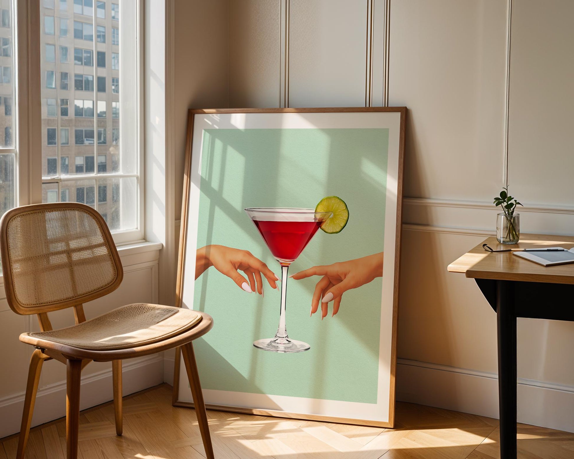 Bring a touch of glam and modern femininity to your space with this striking Cosmopolitan Cocktail Wall Art. Featuring two elegant hands reaching for a vivid pink martini with a fresh lime garnish, this piece adds a pop of color and sophistication to any bar cart, kitchen, or gallery wall.