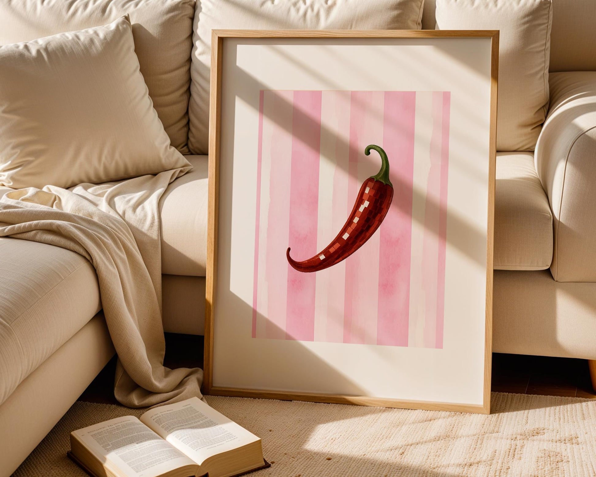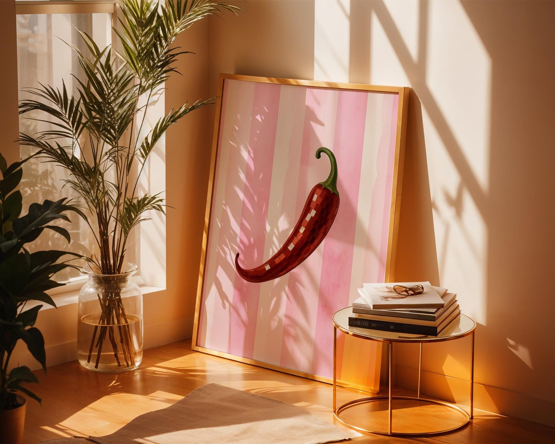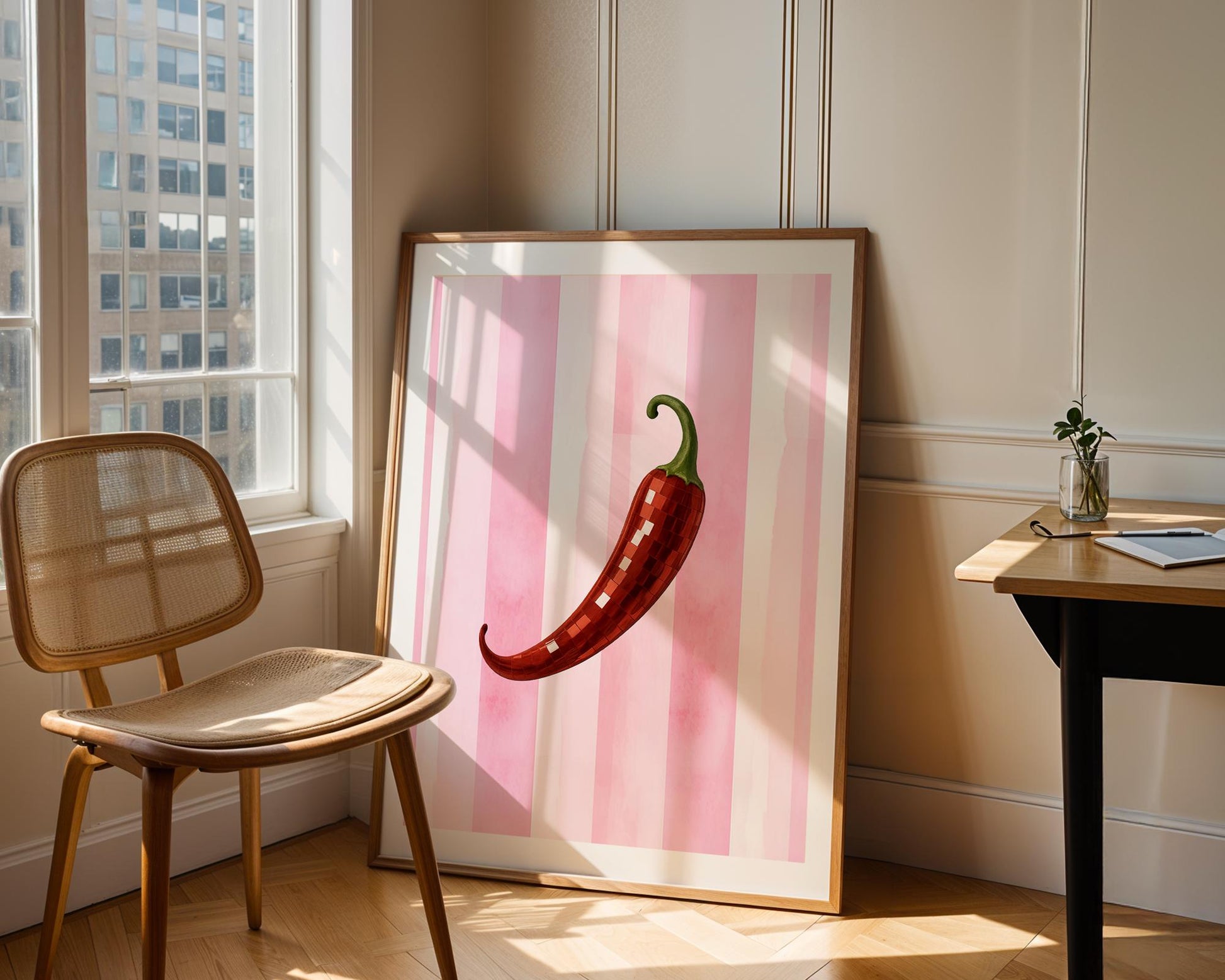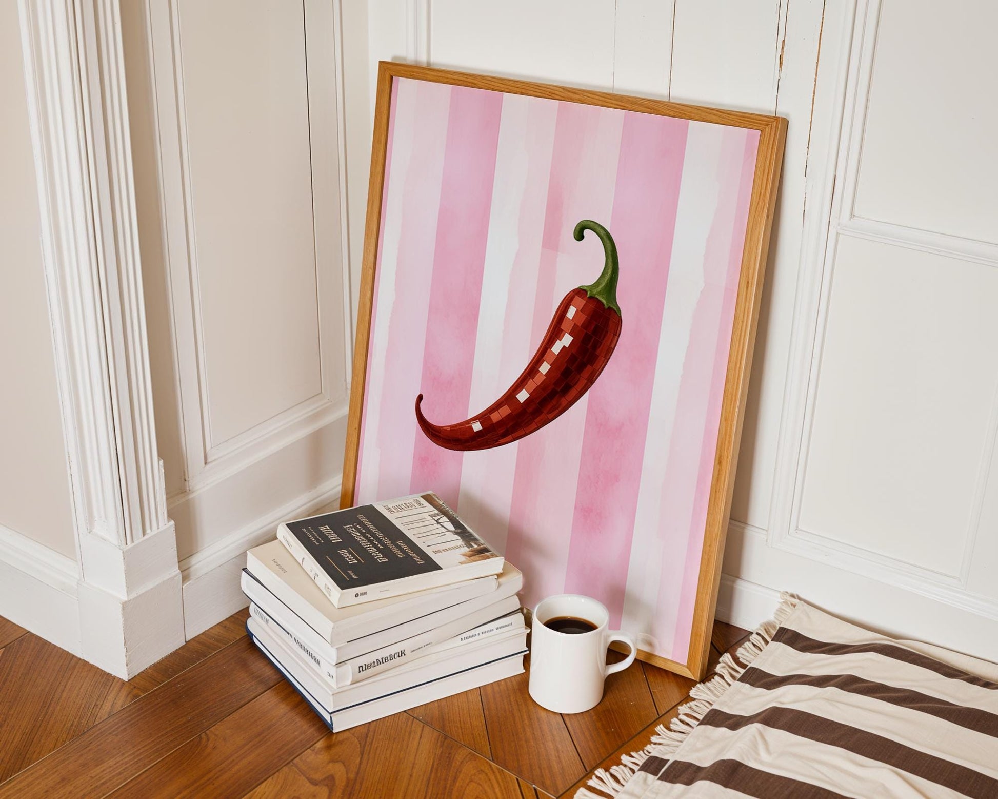 Disco Chili Pepper Wall Art – Funky Red Hot Pepper Print, Pink Striped Kitchen Decor, Retro Spicy Vegetable Poster, Y2K Aesthetic Art