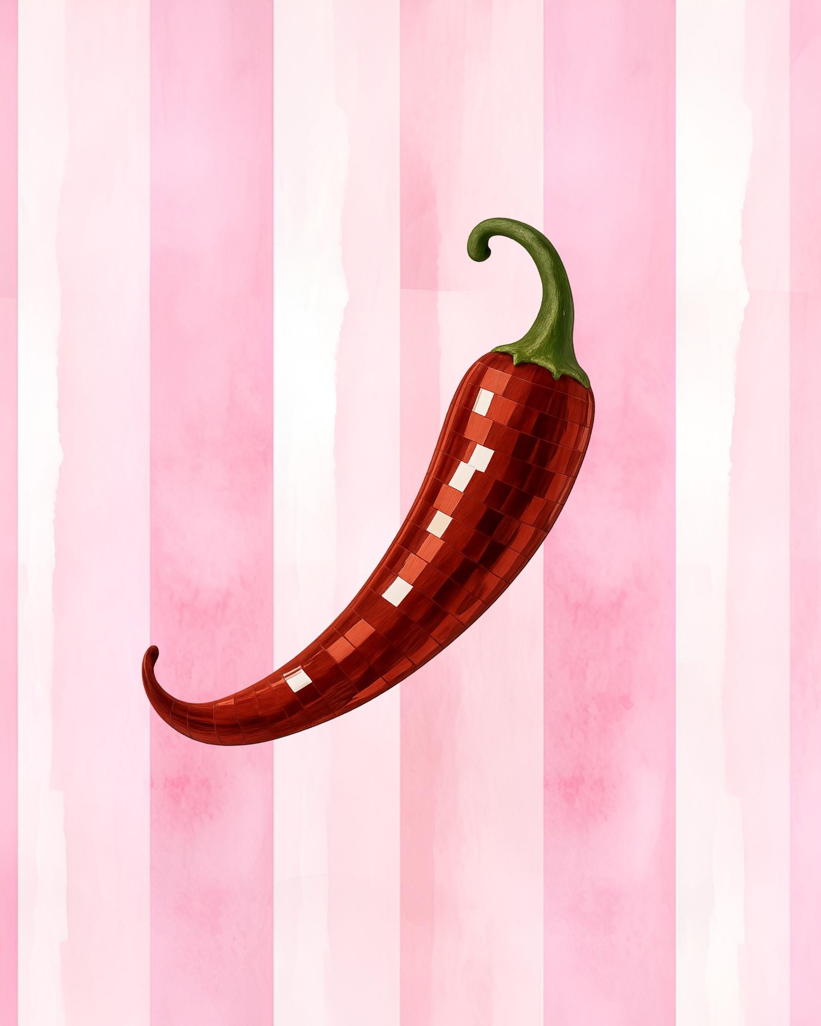 Bring the heat and the groove to your space with this Disco Chili Pepper Wall Art! This bold and playful print features a shiny red pepper styled like a disco ball, set against a chic pink striped background - perfect for adding a fun, retro twist to your kitchen, dining room, or gallery wall.
