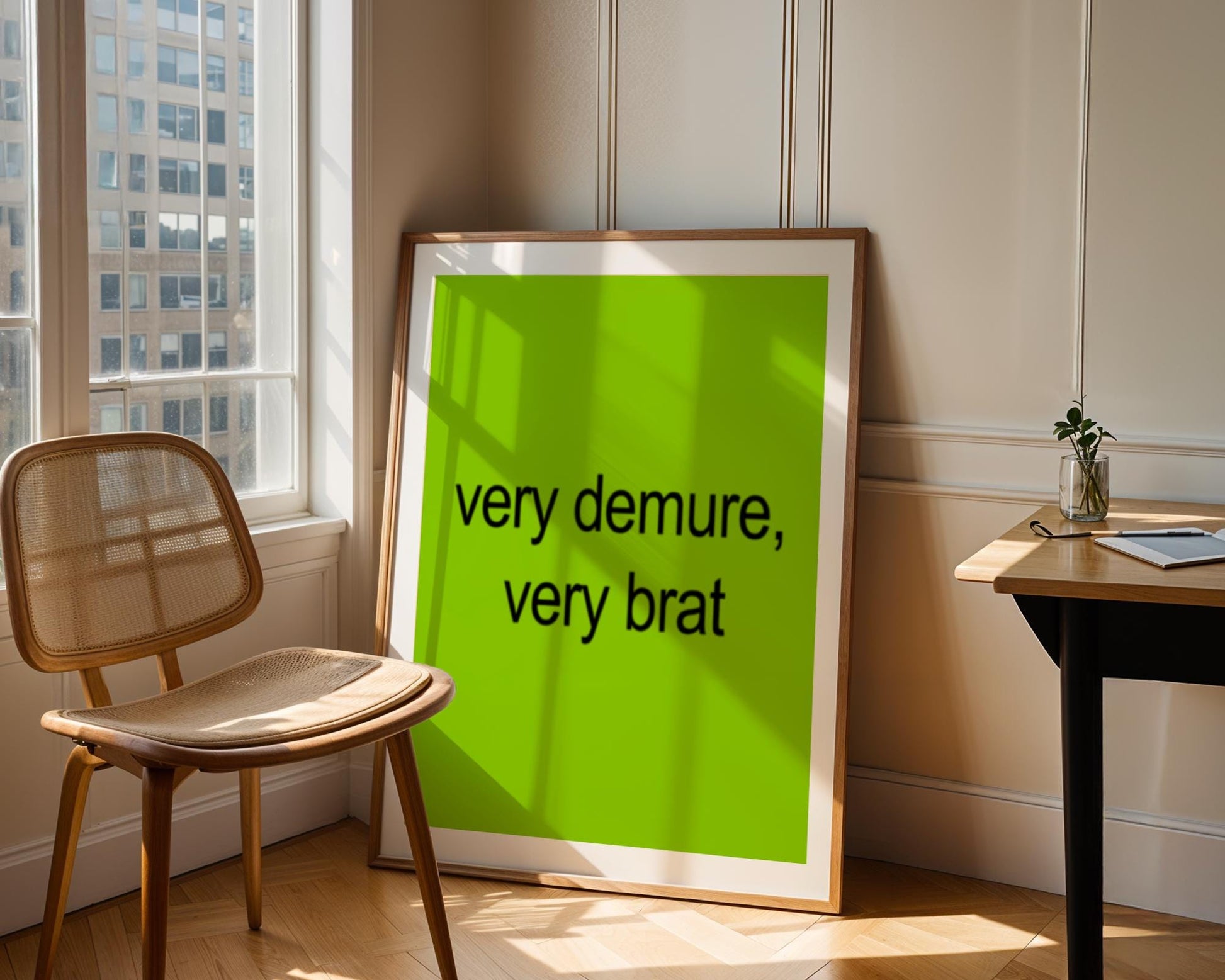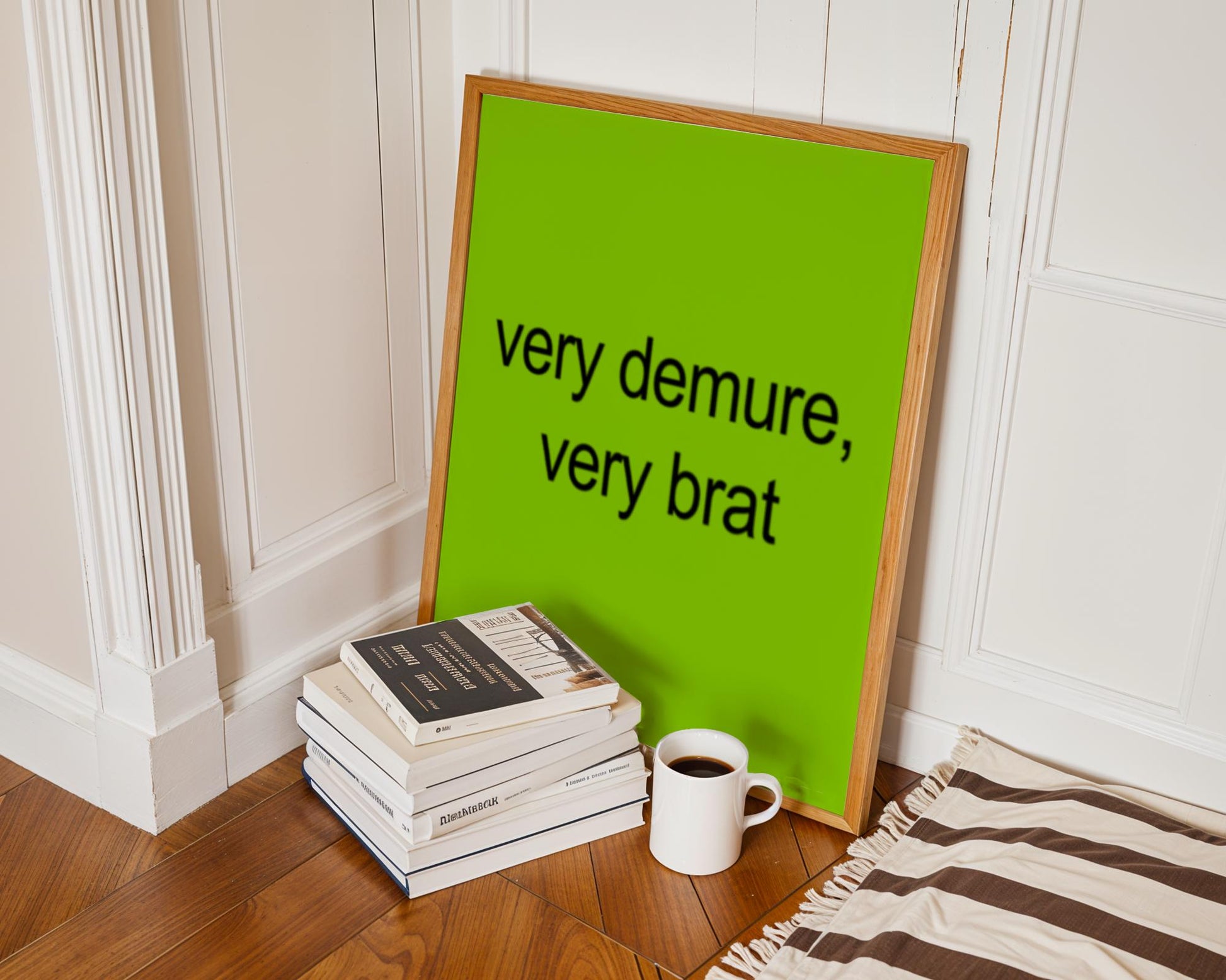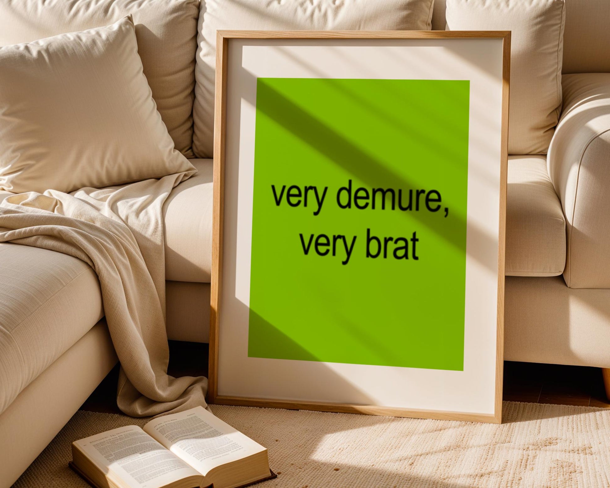 Bring bold energy to your walls with this "Very Demure, Very Brat" funny quote print! Perfect for lovers of sassy wall decor, bratty aesthetic posters, and bold typography art, this lime green print adds the perfect pop of color and personality to any bedroom, dorm room, office, or gallery wall. Whether you're decorating with a cottagecore-meets-bratcore vibe or just love unique statement pieces, this minimalist yet loud poster is made to stand out.