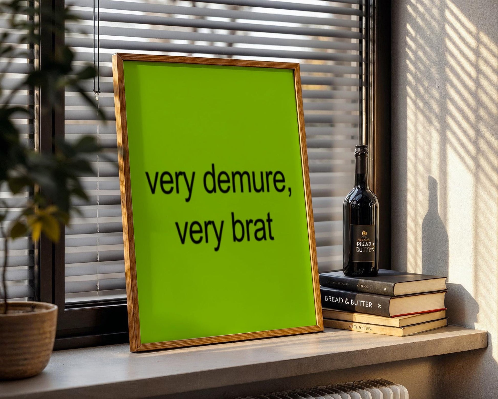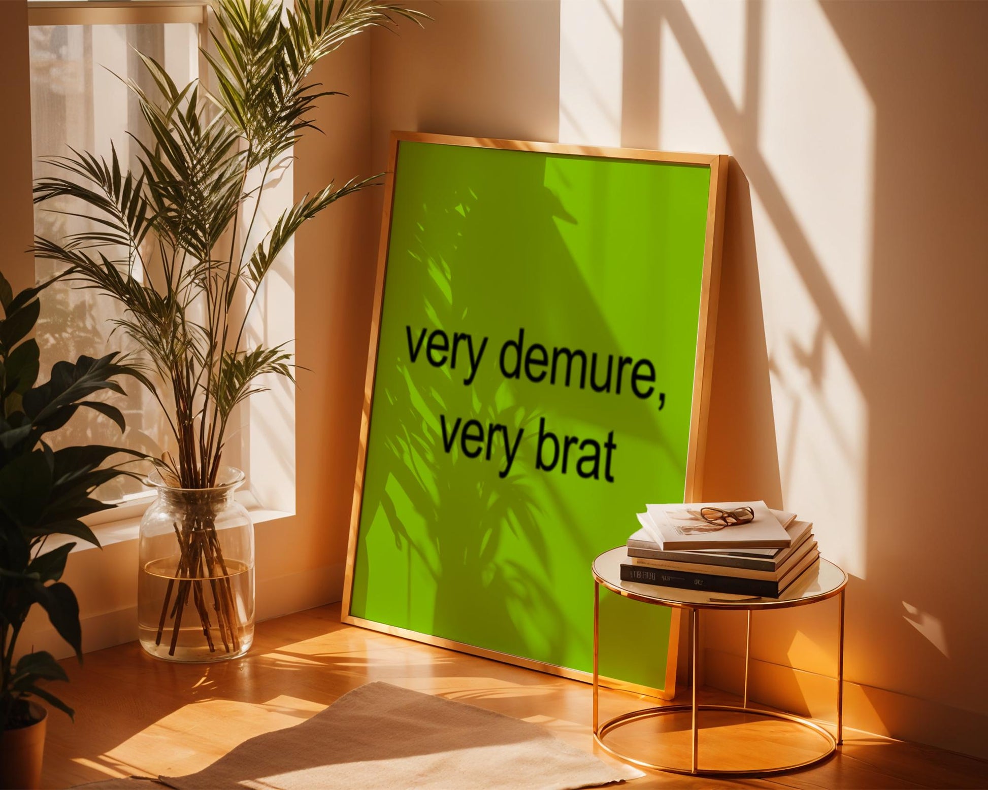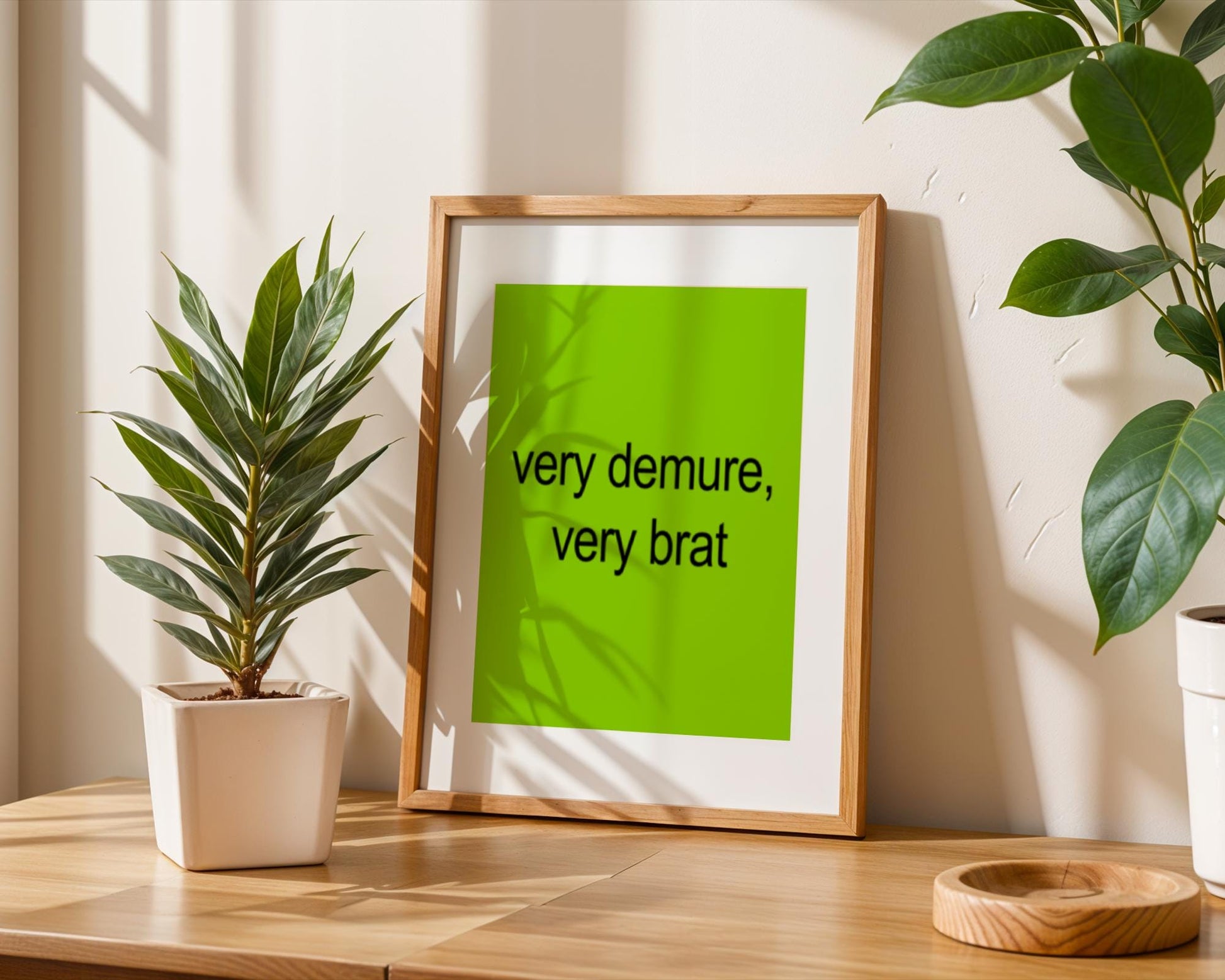 Bring bold energy to your walls with this "Very Demure, Very Brat" funny quote print! Perfect for lovers of sassy wall decor, bratty aesthetic posters, and bold typography art, this lime green print adds the perfect pop of color and personality to any bedroom, dorm room, office, or gallery wall. Whether you're decorating with a cottagecore-meets-bratcore vibe or just love unique statement pieces, this minimalist yet loud poster is made to stand out.