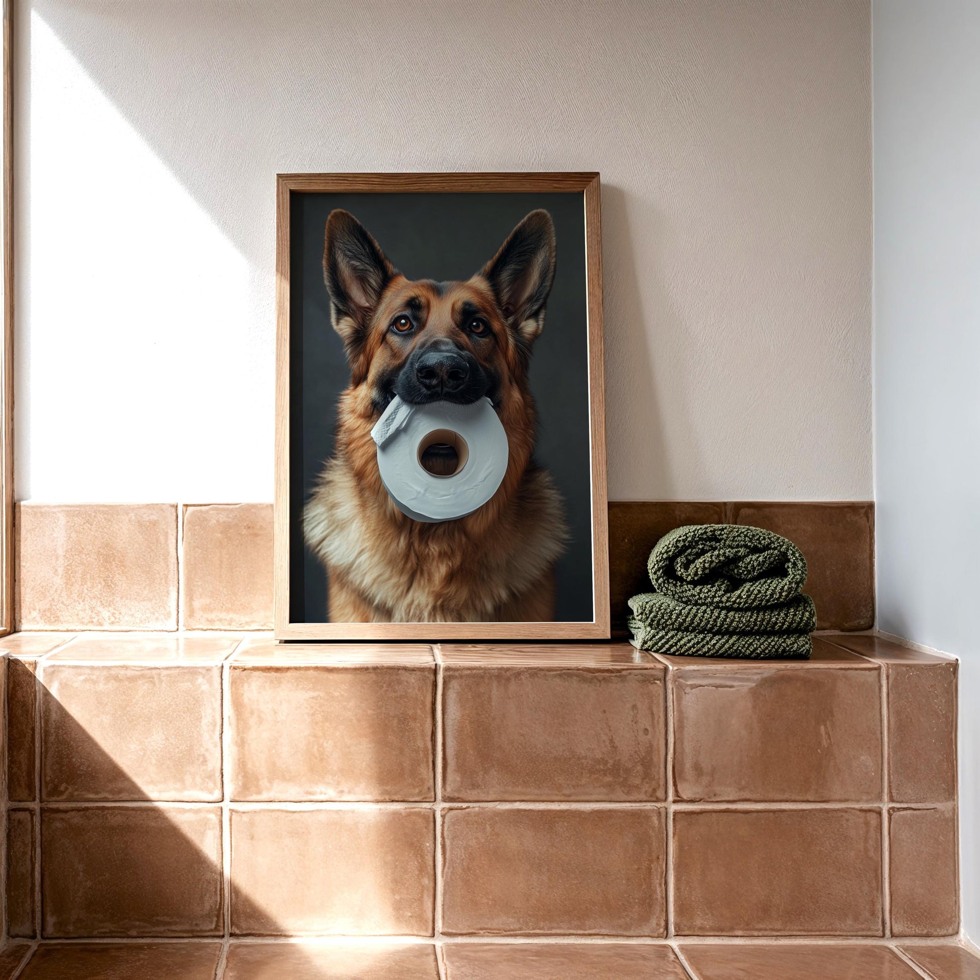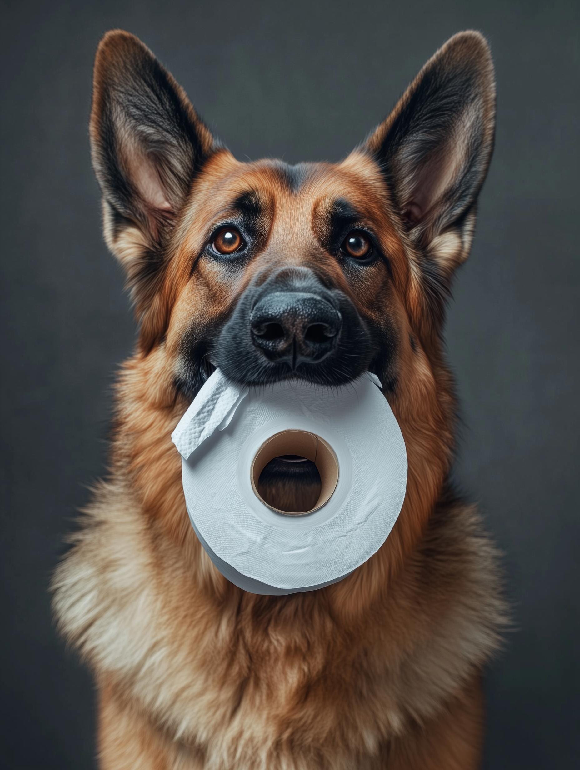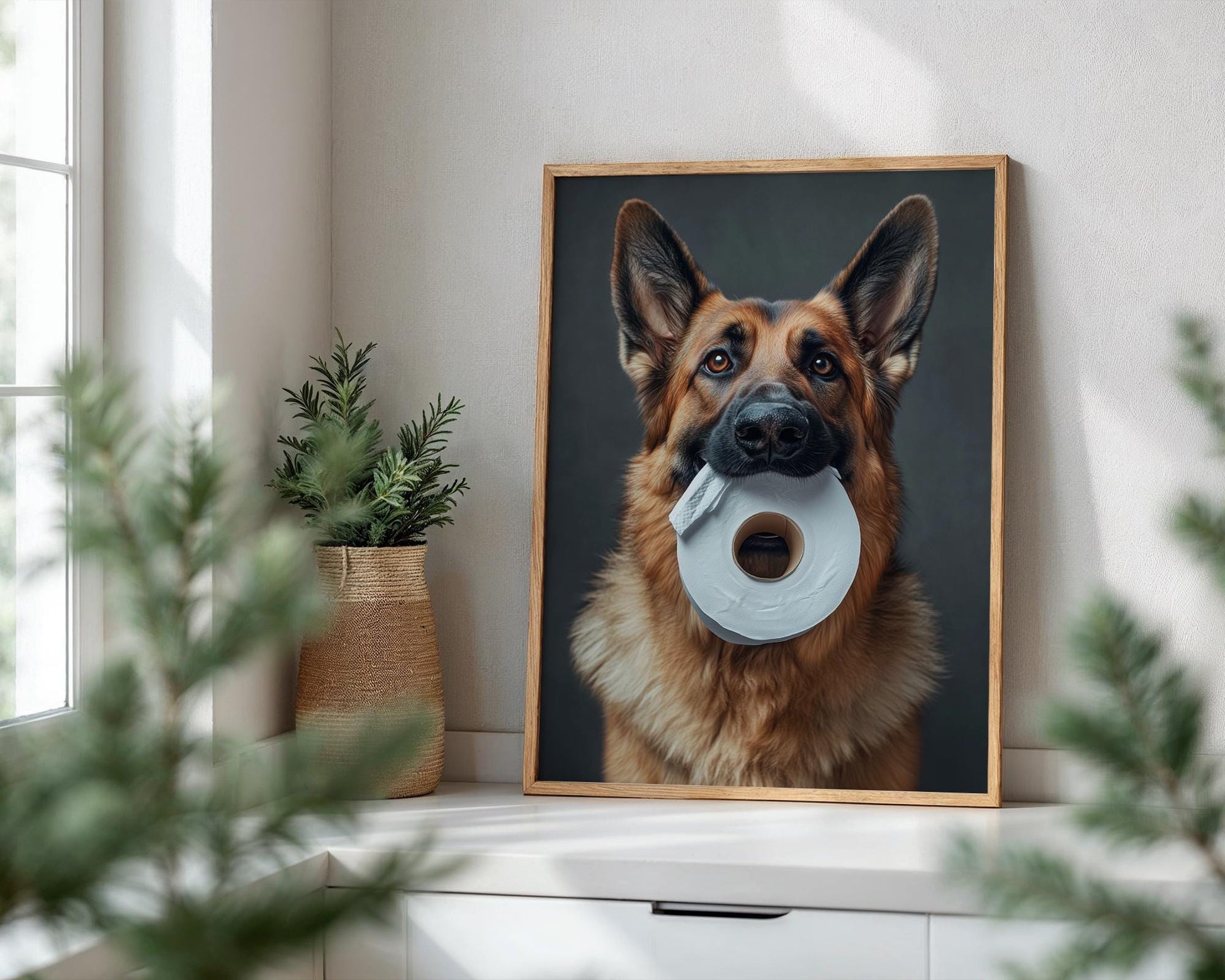πΆπ§» Add a touch of humor and heart to your space with this adorable image of a German Shepherd holding a roll of toilet paper! This high-resolution pet portrait is perfect for dog lovers looking for fun and unique wall decor. Whether it's for your bathroom, laundry room, or office, this print is sure to make guests smile! π
