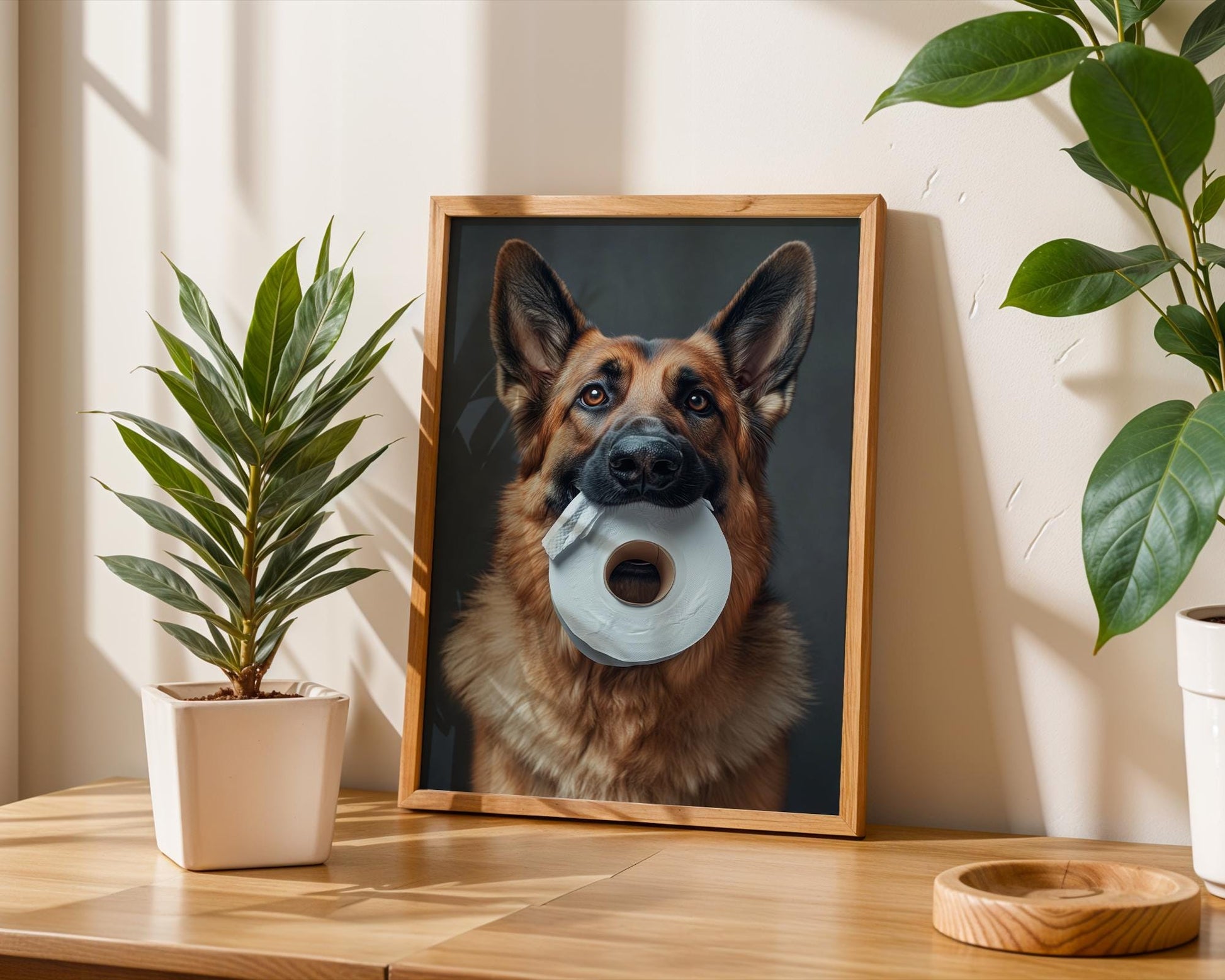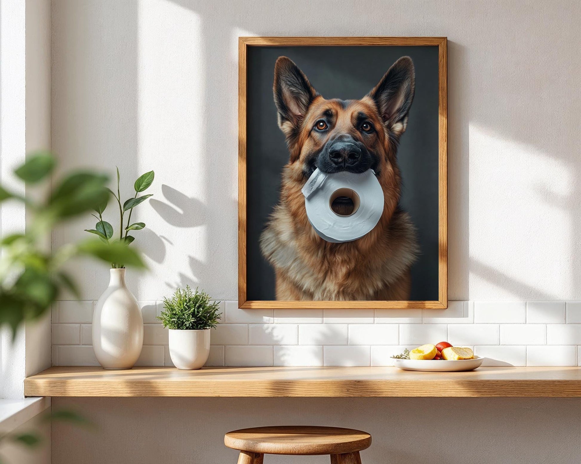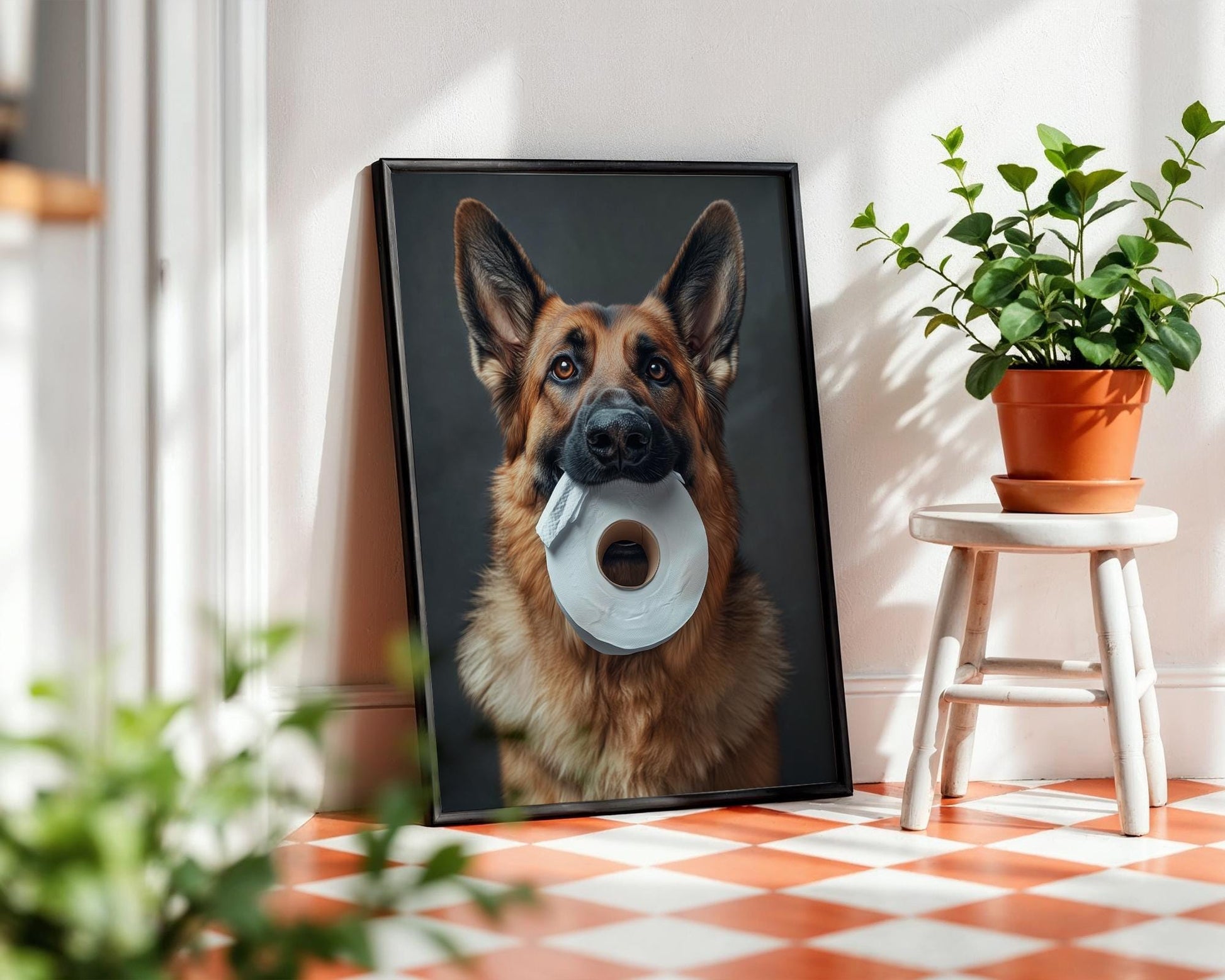 πΆπ§» Add a touch of humor and heart to your space with this adorable image of a German Shepherd holding a roll of toilet paper! This high-resolution pet portrait is perfect for dog lovers looking for fun and unique wall decor. Whether it's for your bathroom, laundry room, or office, this print is sure to make guests smile! π