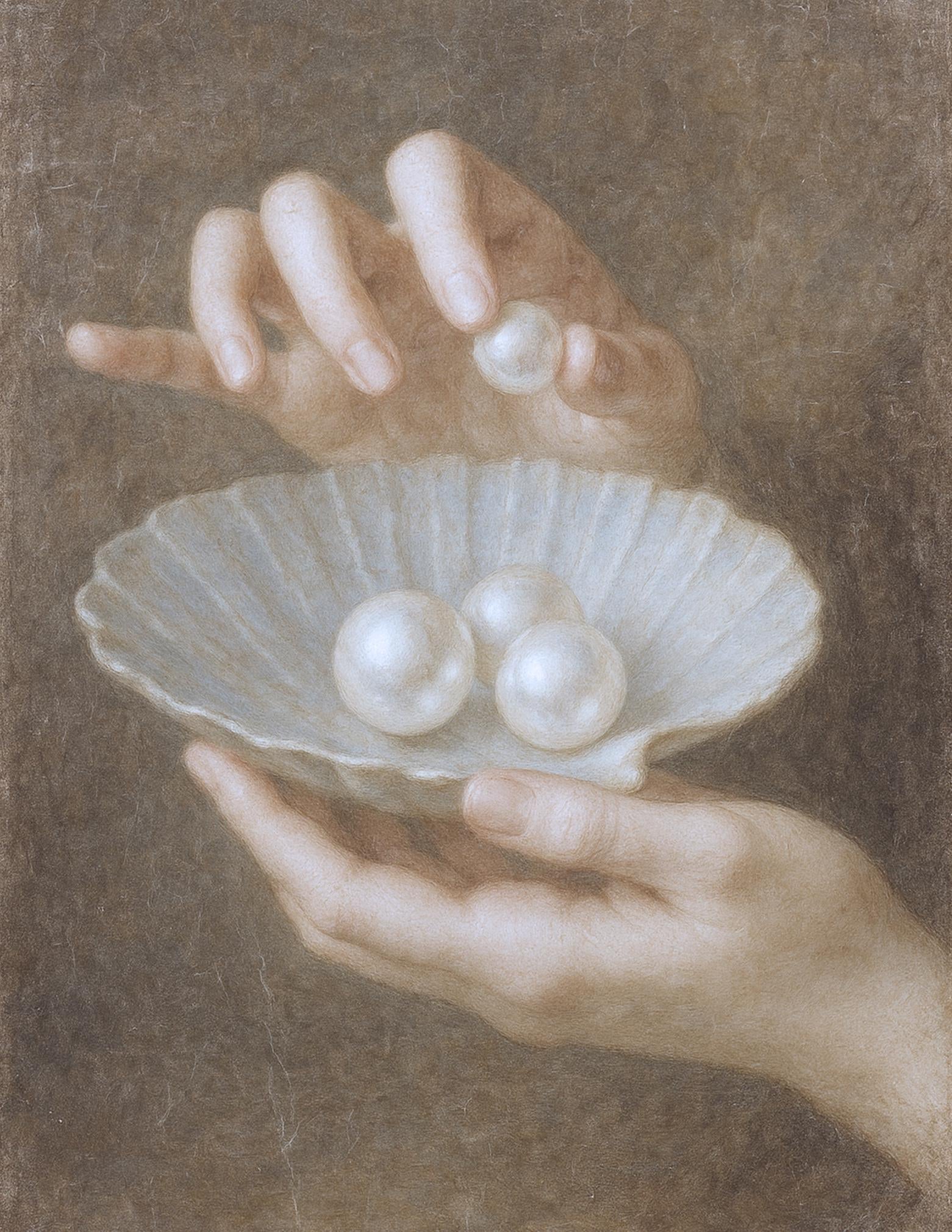 Showcases the delicate elegance of pearls, drapery, and symbolic gesture