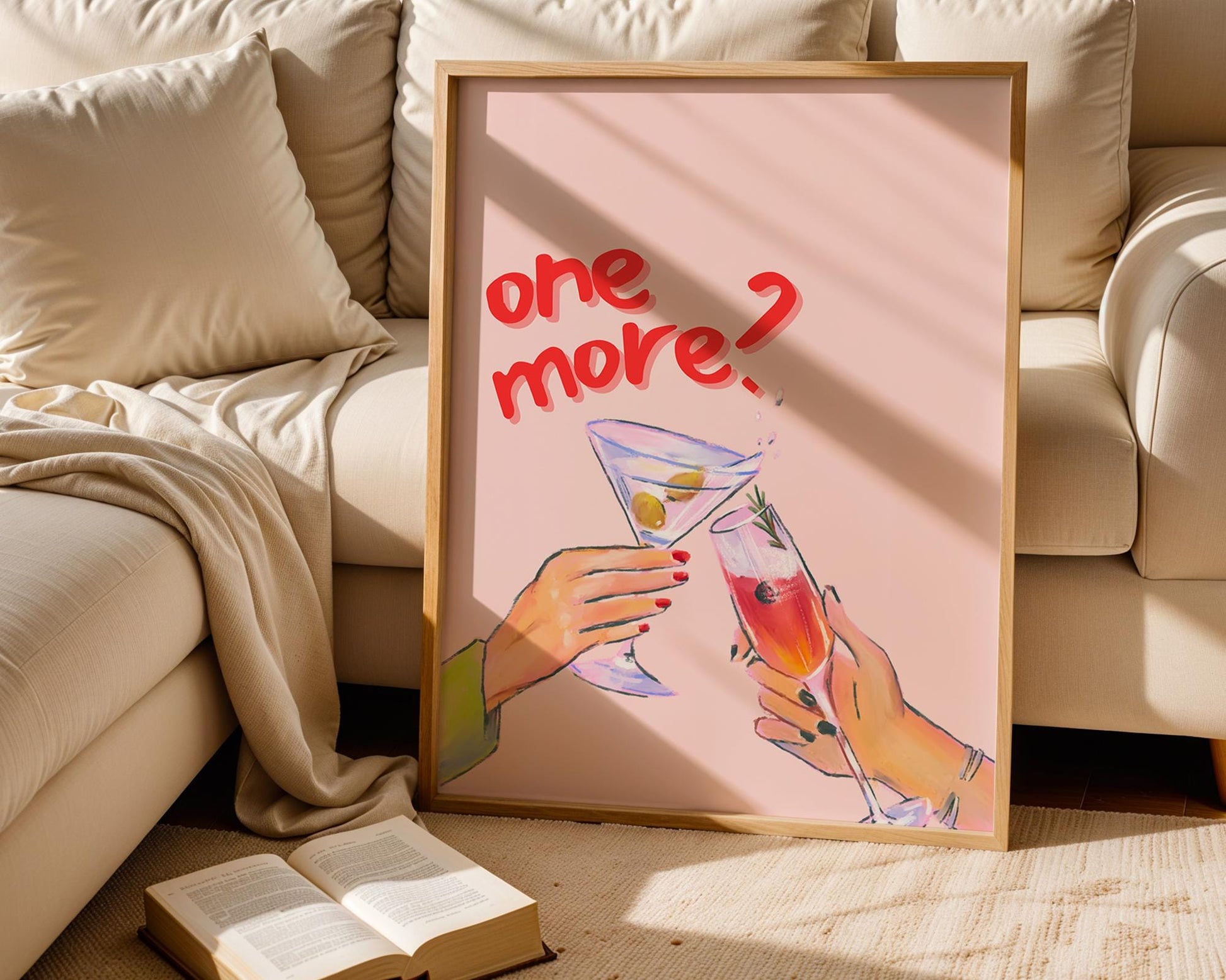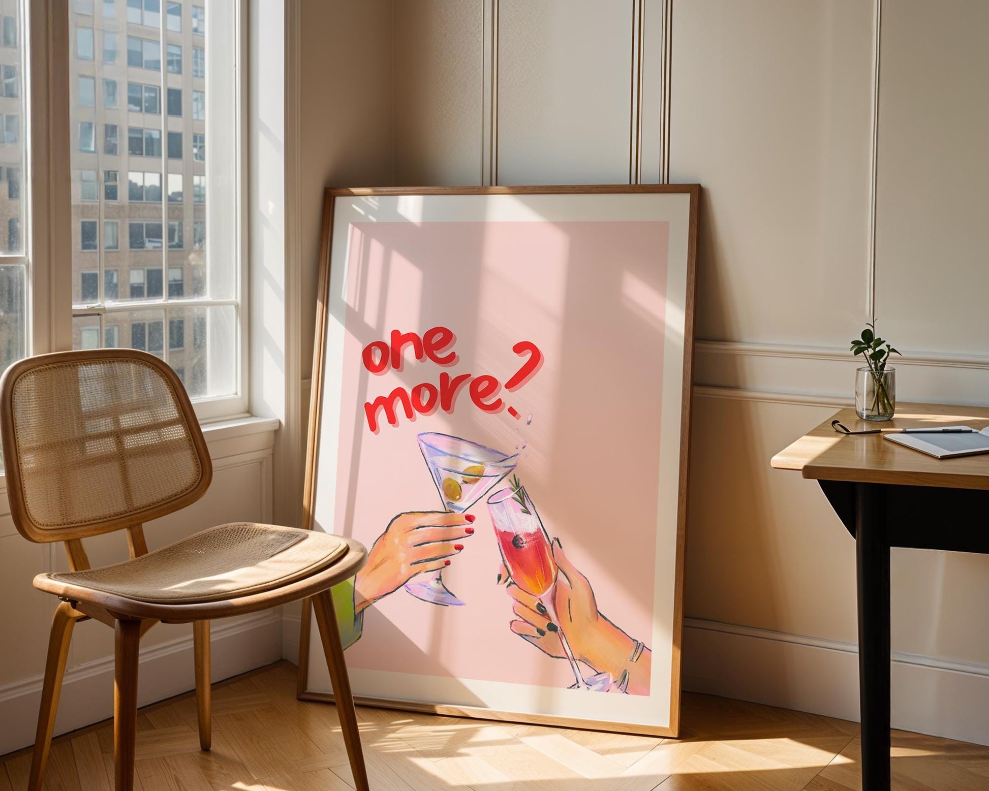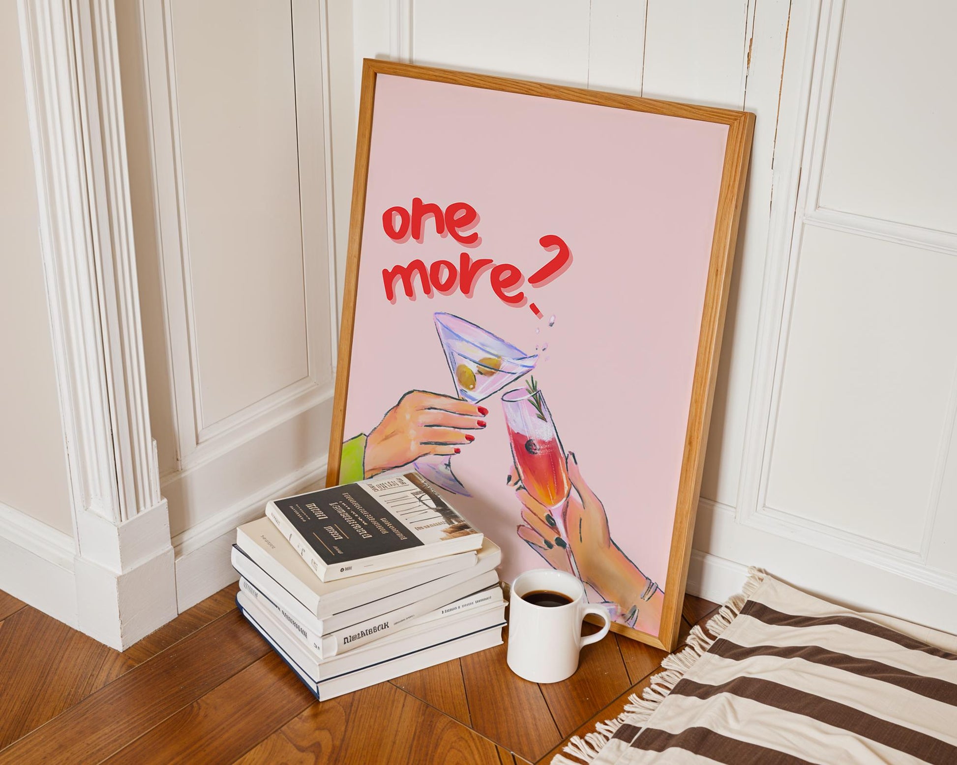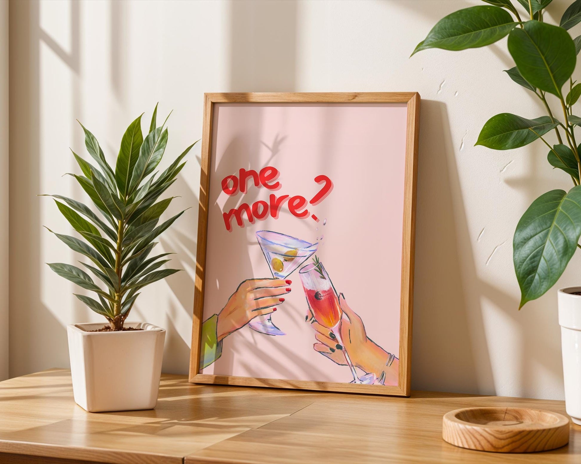 Bring a splash of personality to your space with this vibrant, hand-illustrated print featuring two stylish hands clinking cocktails. With its playful "one more?" caption and pastel aesthetic, it's the ultimate vibe for girls' night, bachelorette decor, or your favorite drinking buddy's gift.