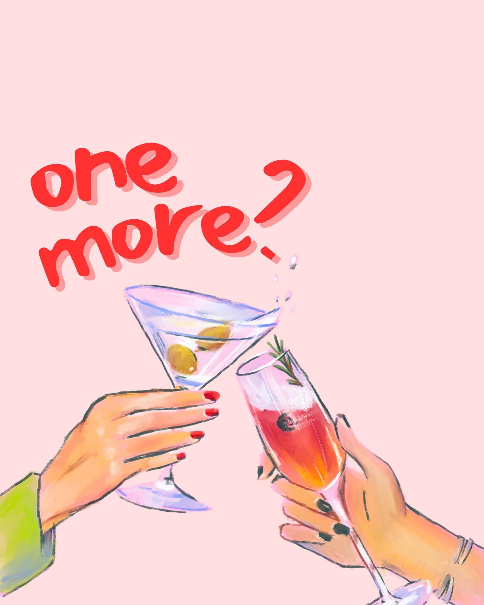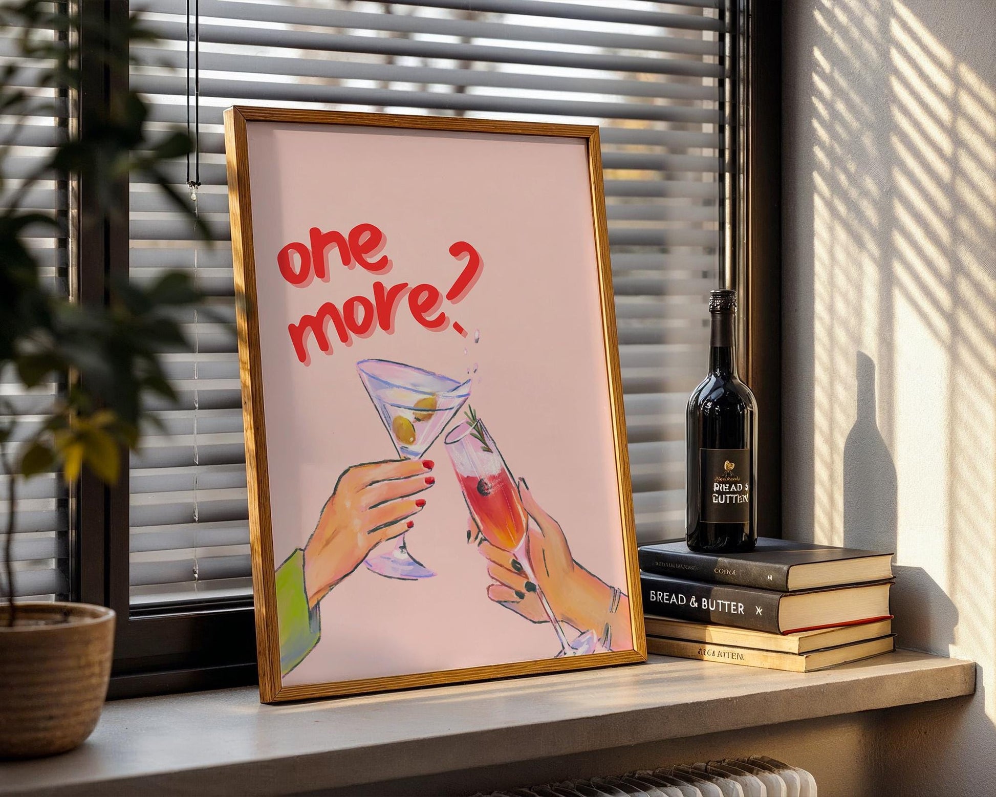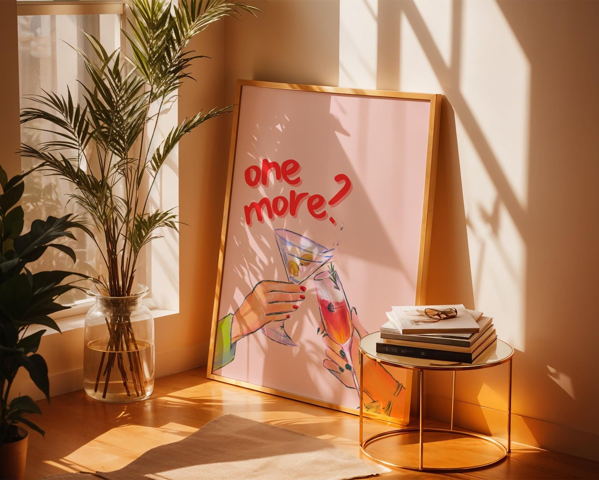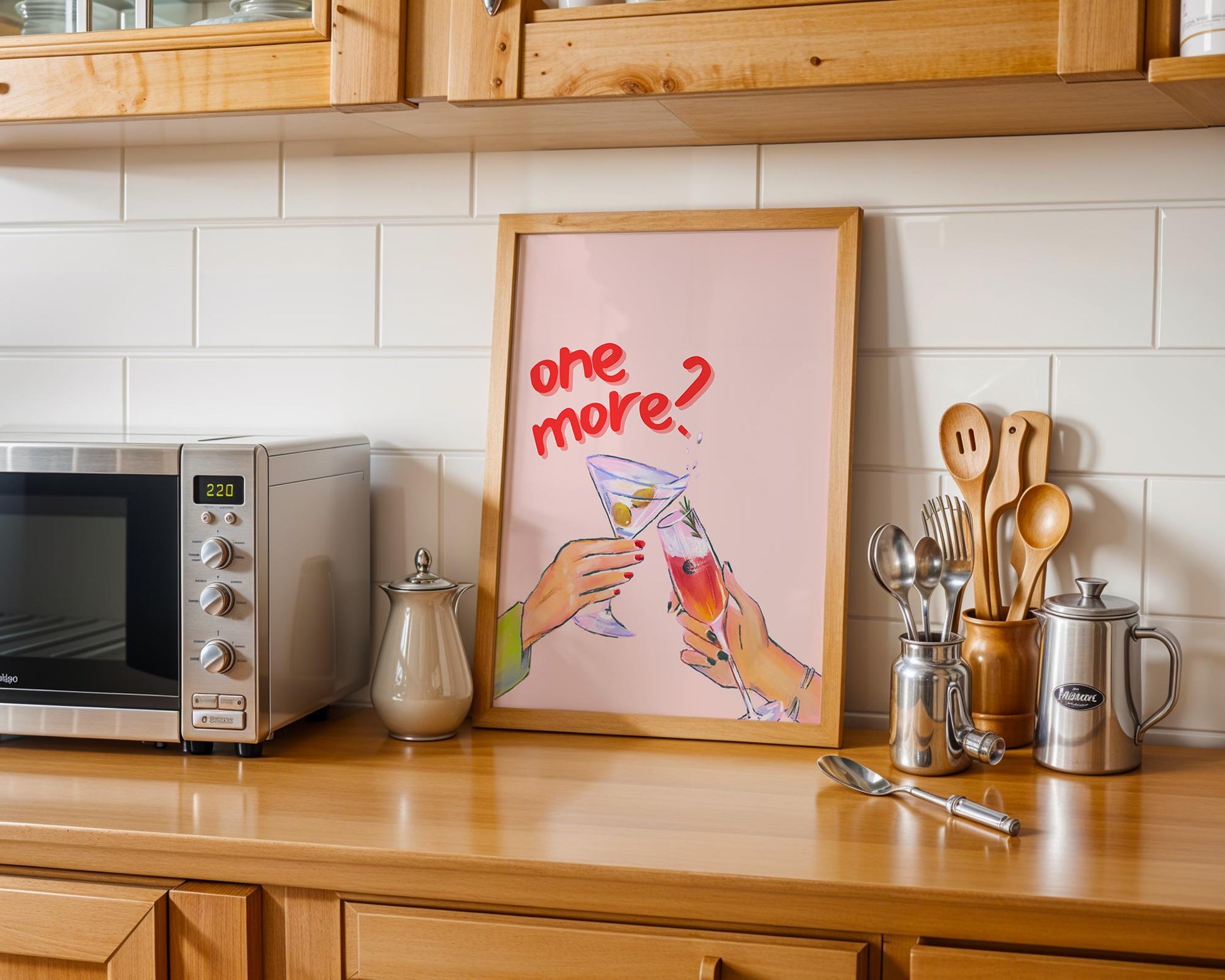 Bring a splash of personality to your space with this vibrant, hand-illustrated print featuring two stylish hands clinking cocktails. With its playful "one more?" caption and pastel aesthetic, it's the ultimate vibe for girls' night, bachelorette decor, or your favorite drinking buddy's gift.