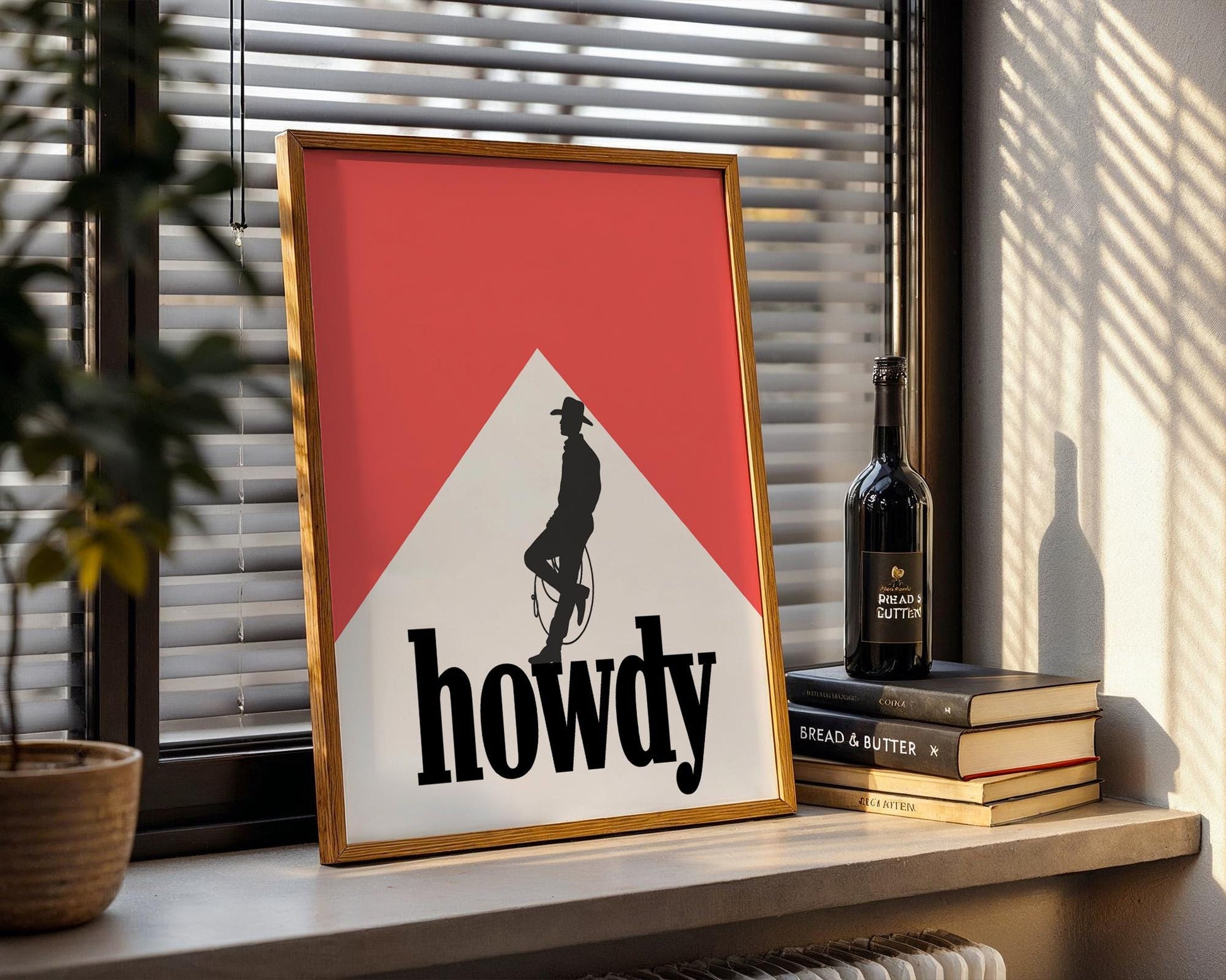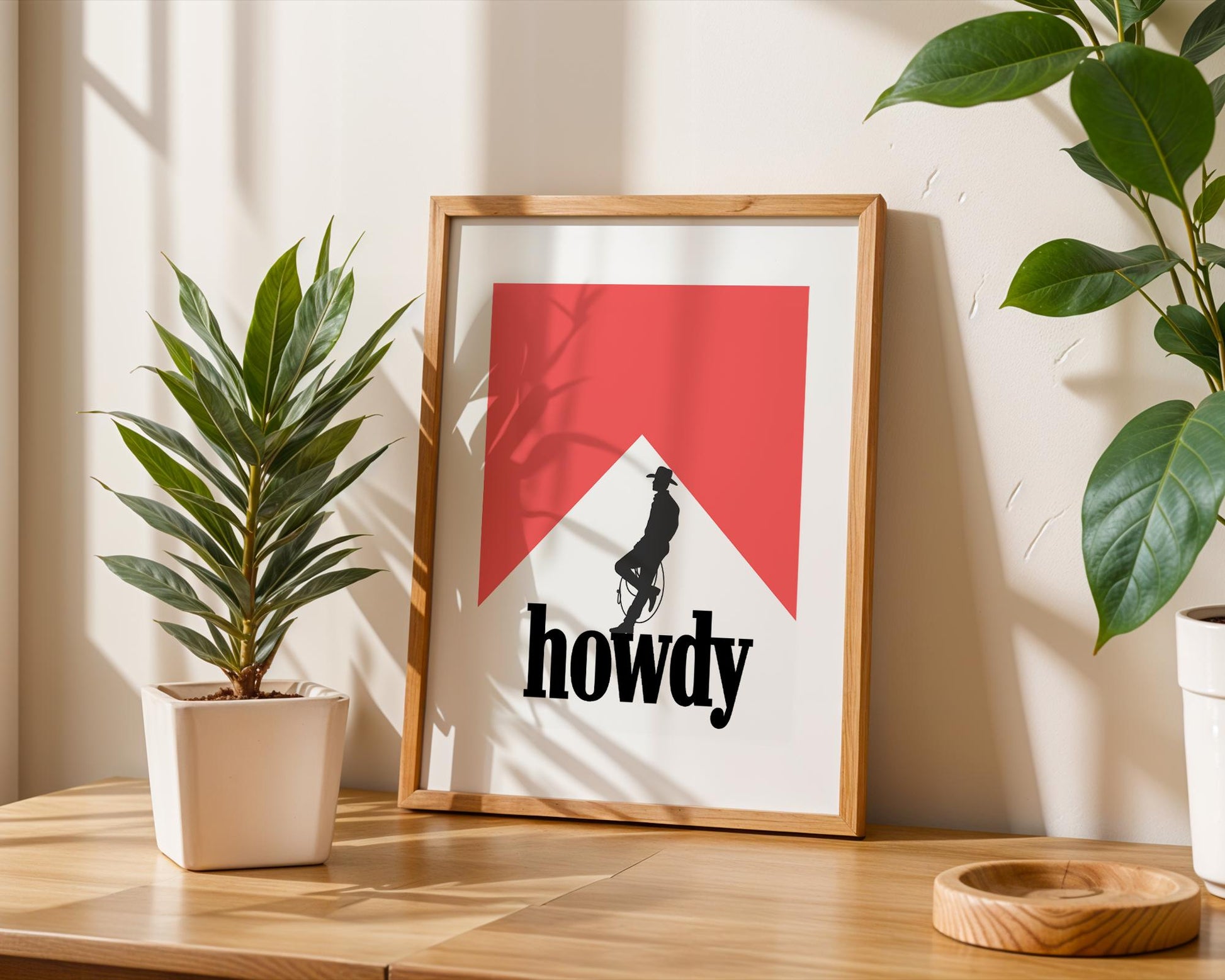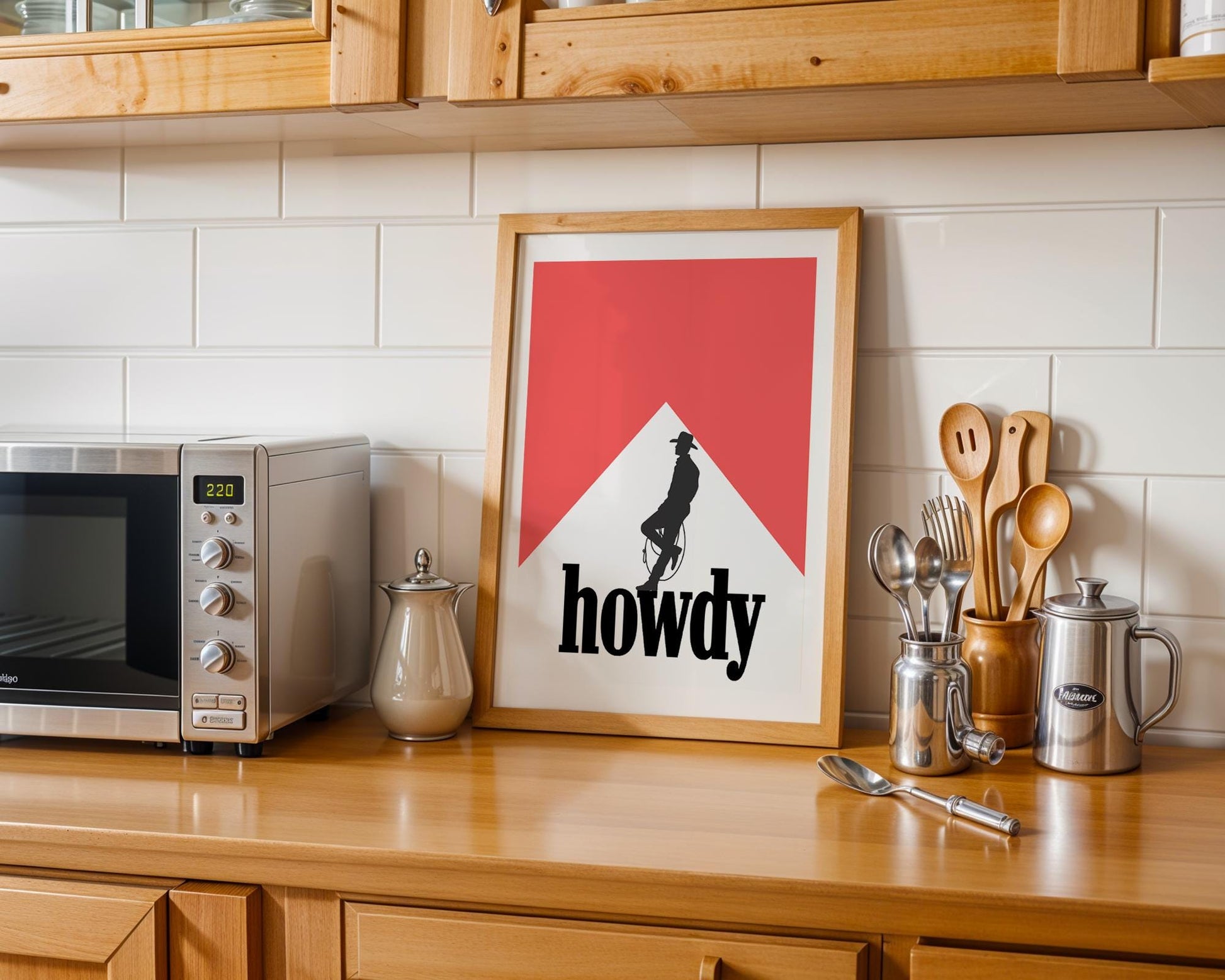 This "Howdy" cowboy wall art print adds rustic charm and southern personality to any space. Featuring a striking silhouette of a cowboy against a modern geometric design, it's the perfect blend of country and contemporary.