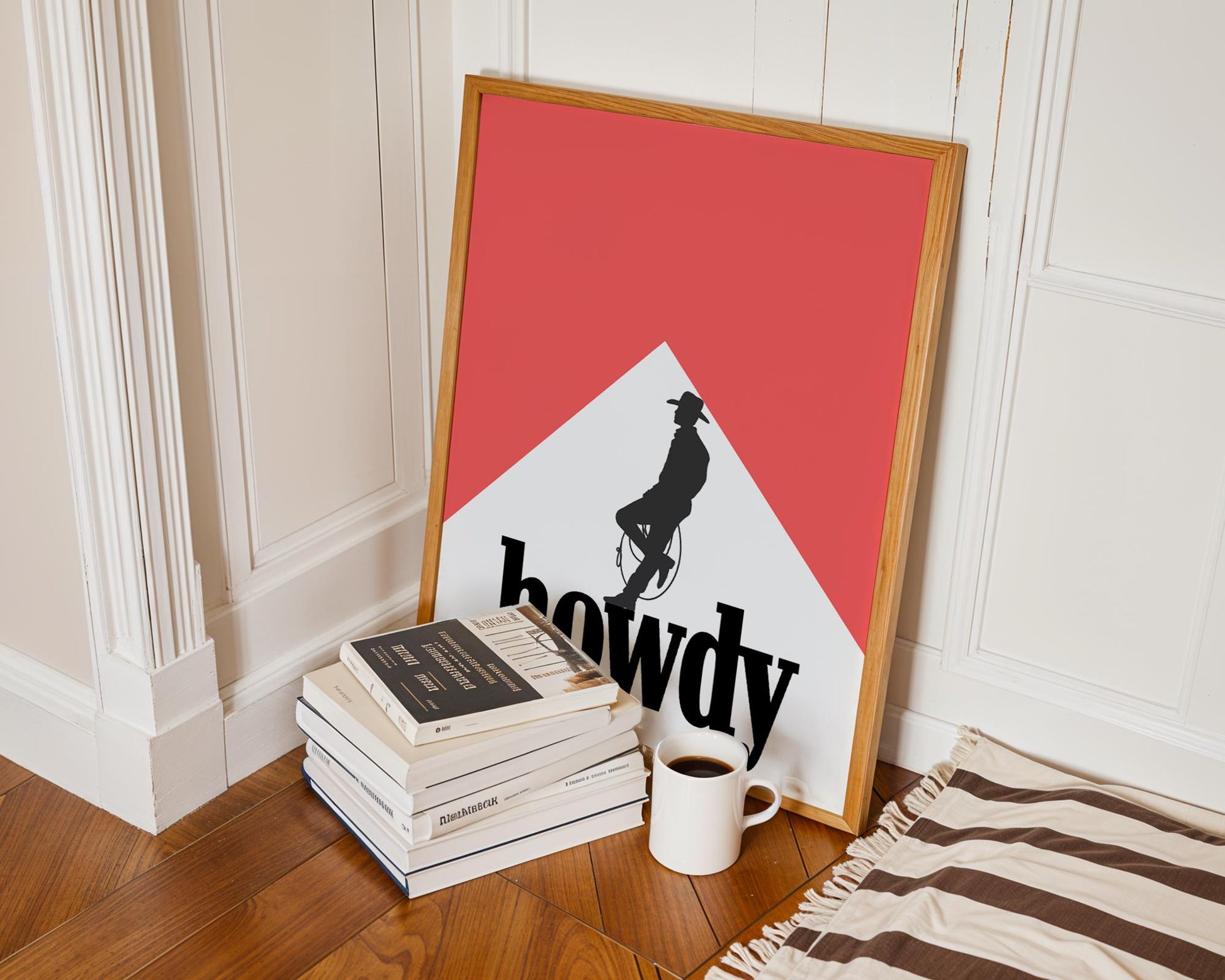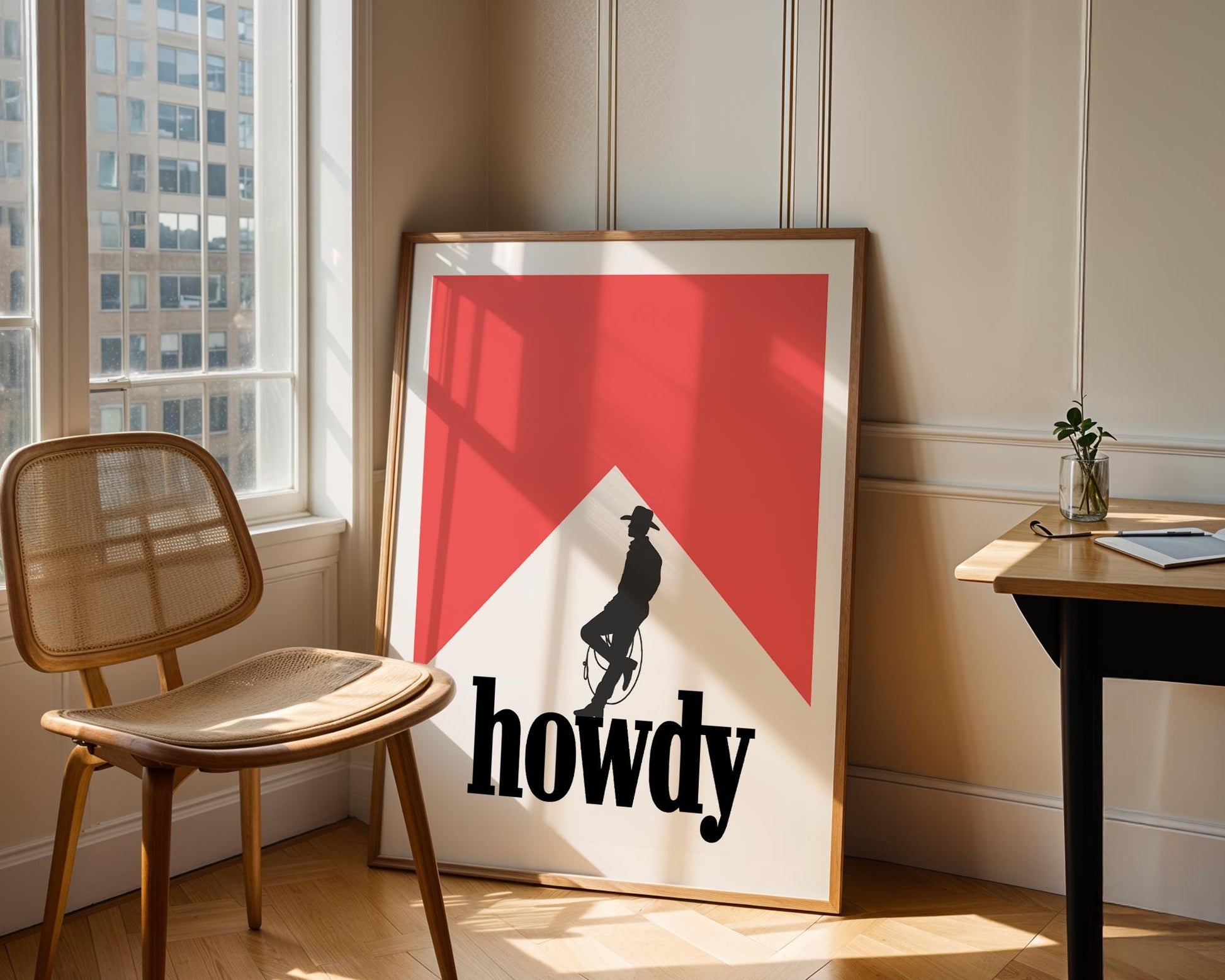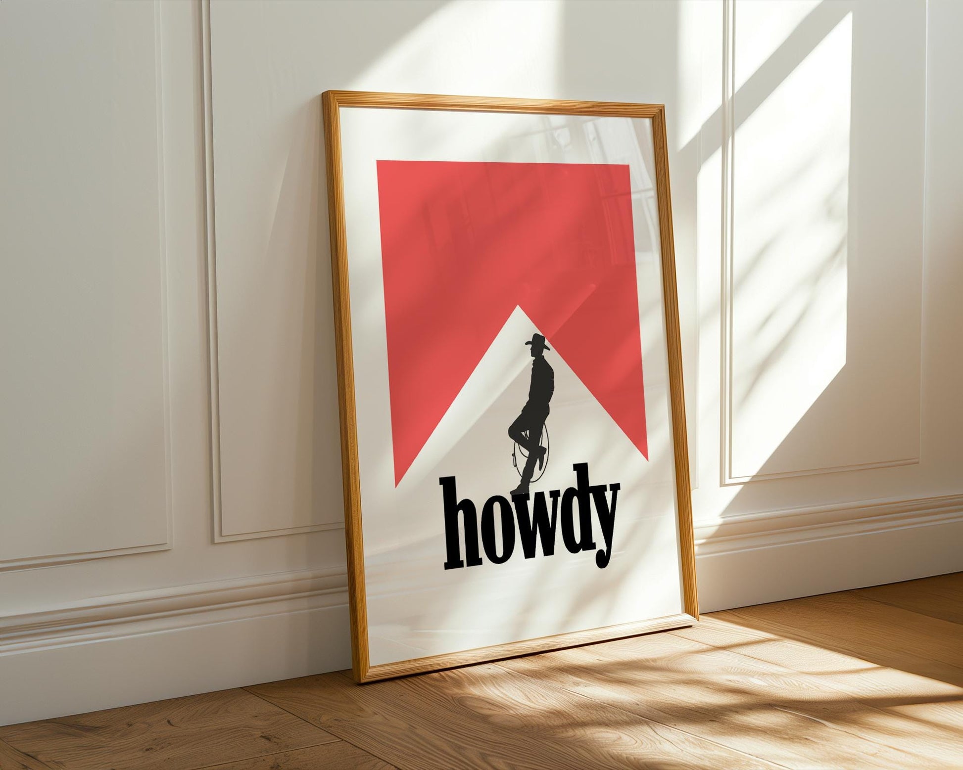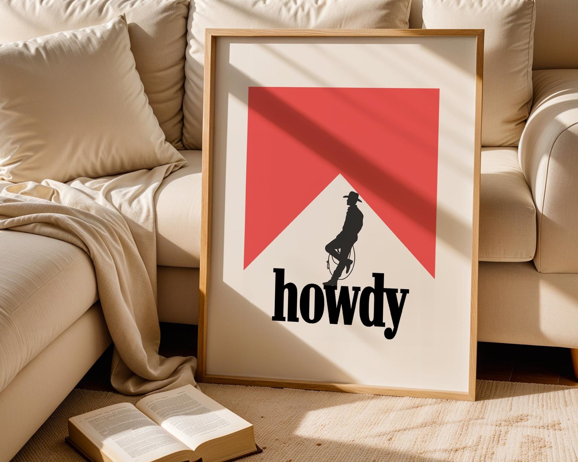This "Howdy" cowboy wall art print adds rustic charm and southern personality to any space. Featuring a striking silhouette of a cowboy against a modern geometric design, it's the perfect blend of country and contemporary.