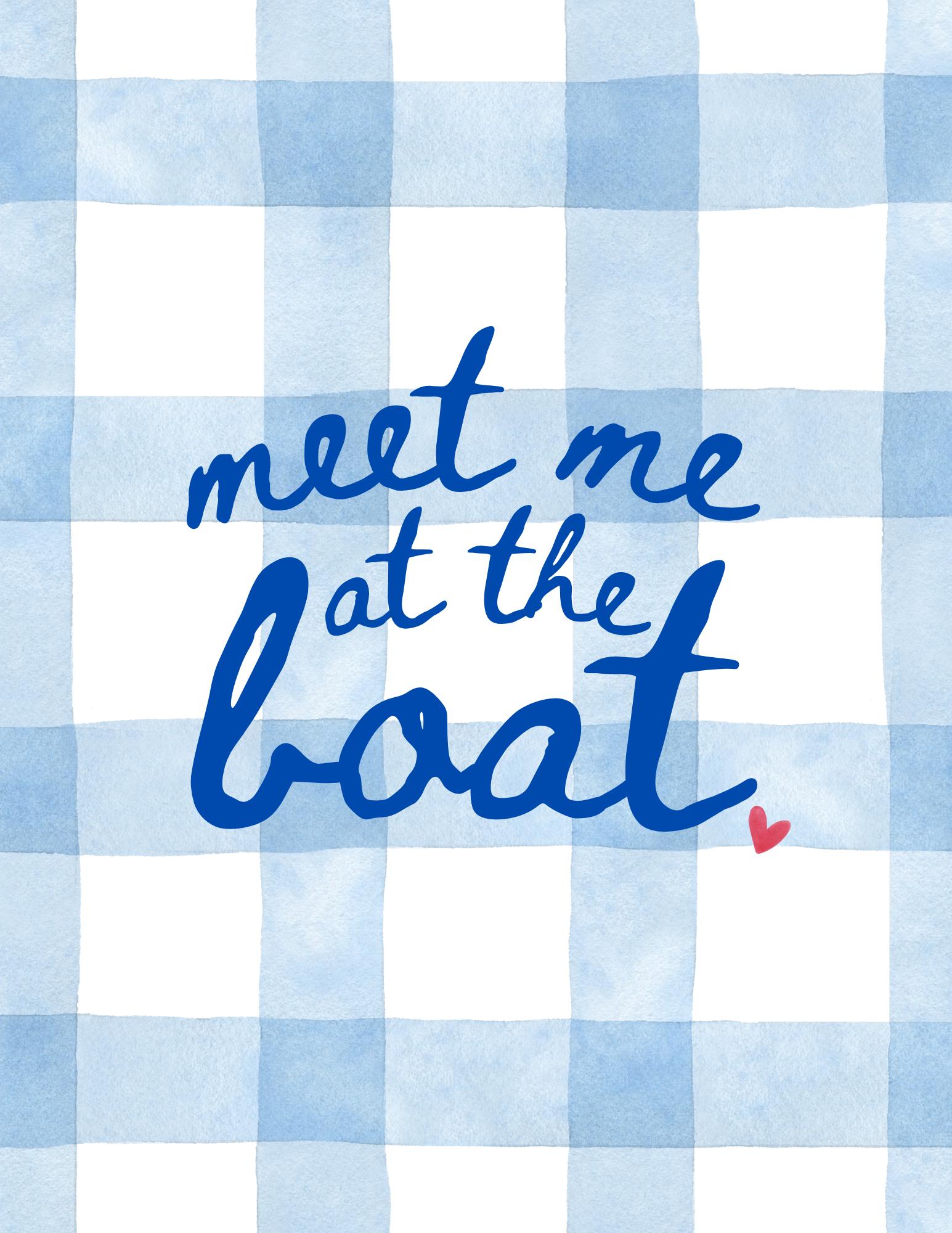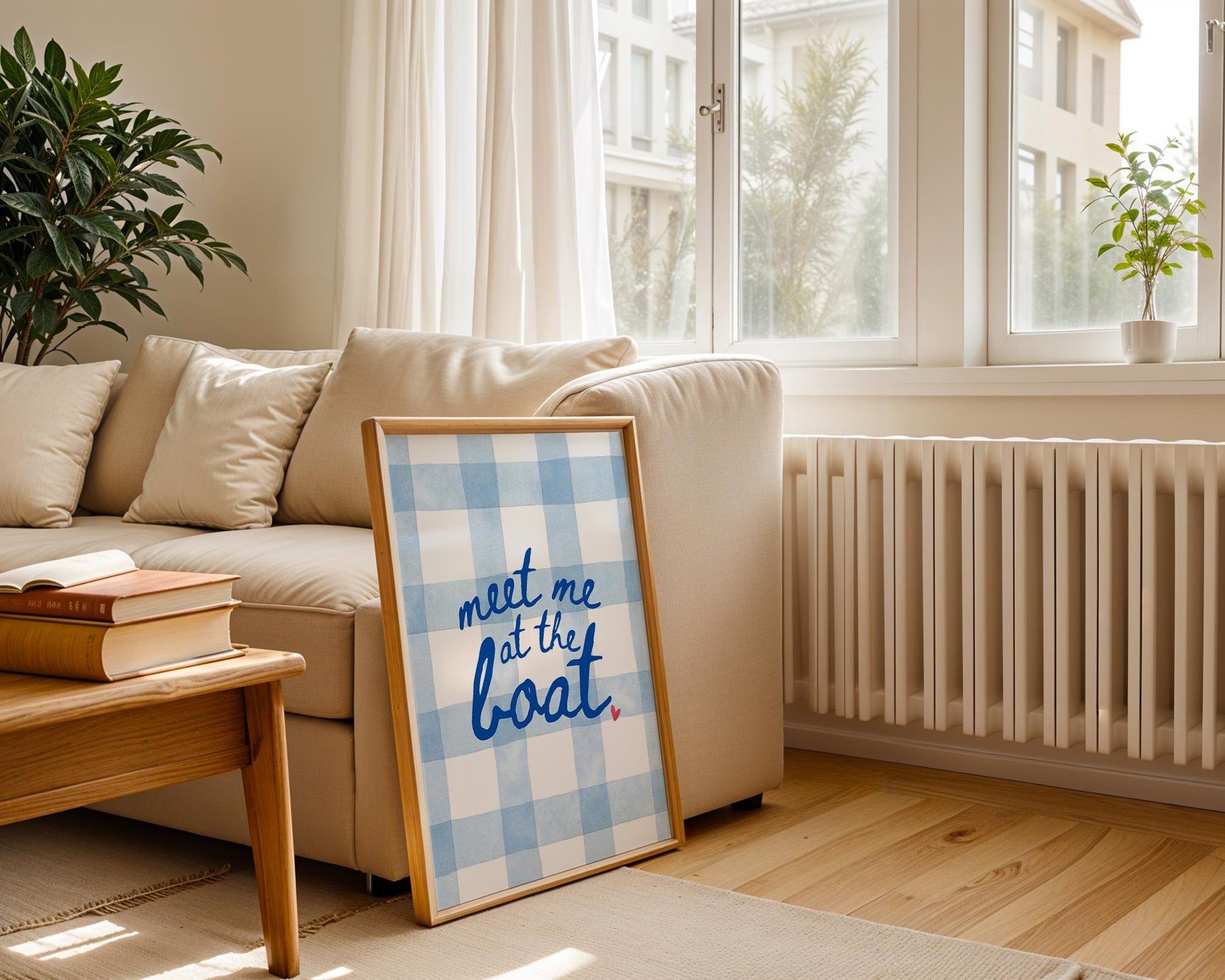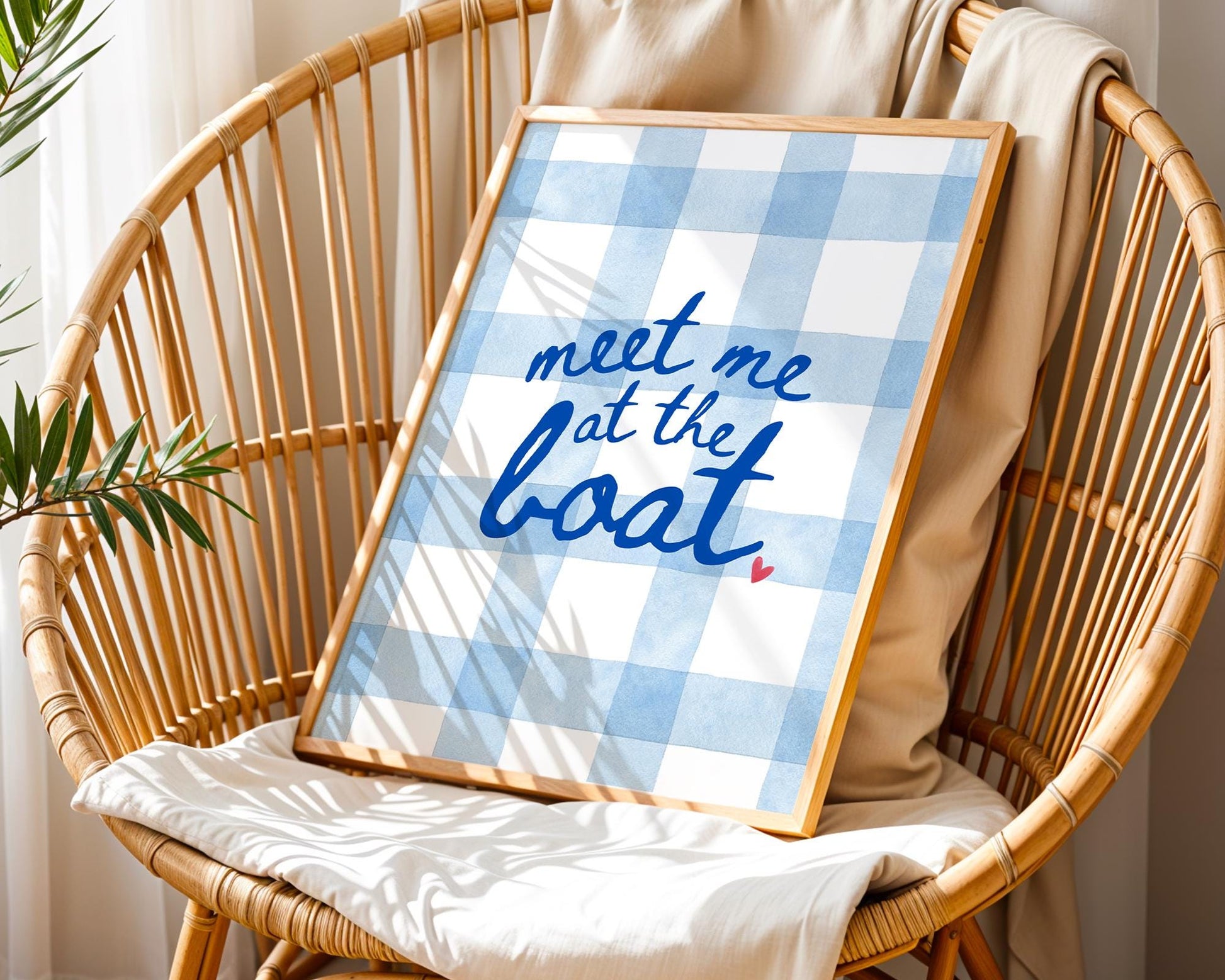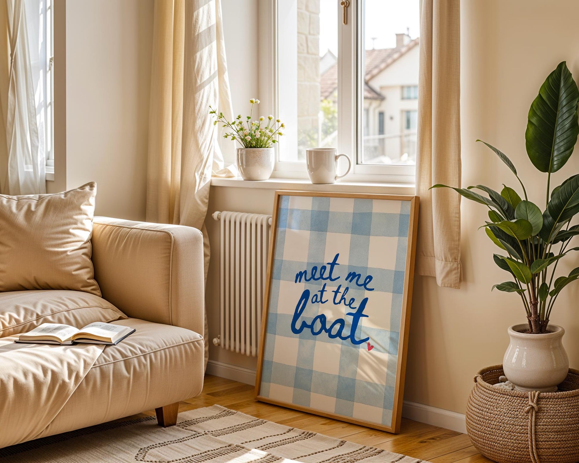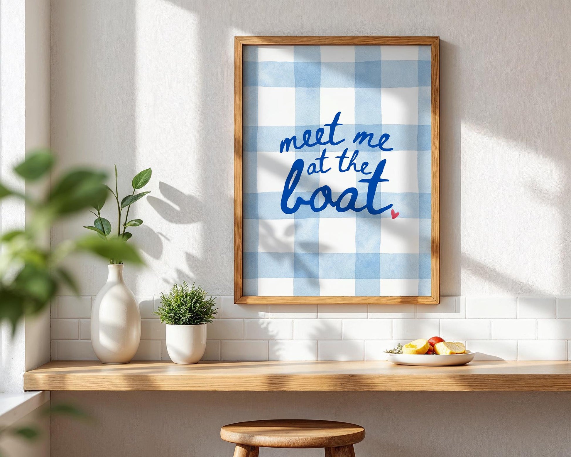 🚤 Add lakeside charm to your space with this cheerful "Meet Me at the Boat" art print, featuring hand-lettered text over soft watercolor-style blue gingham. Perfect for lake house decor, nautical themes, or coastal cottage vibes, this piece brings playful energy and summer adventure to any wall.