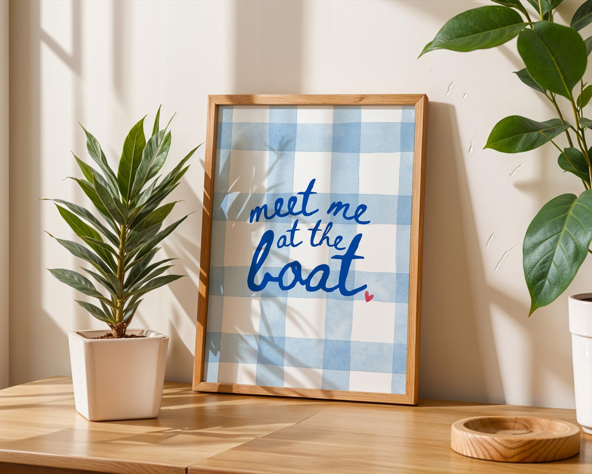 Meet Me at the Boat Art Print – Nautical Lake House Wall Decor, Blue Gingham Summer Sign, Coastal Cabin Quote, Boat Life Gift