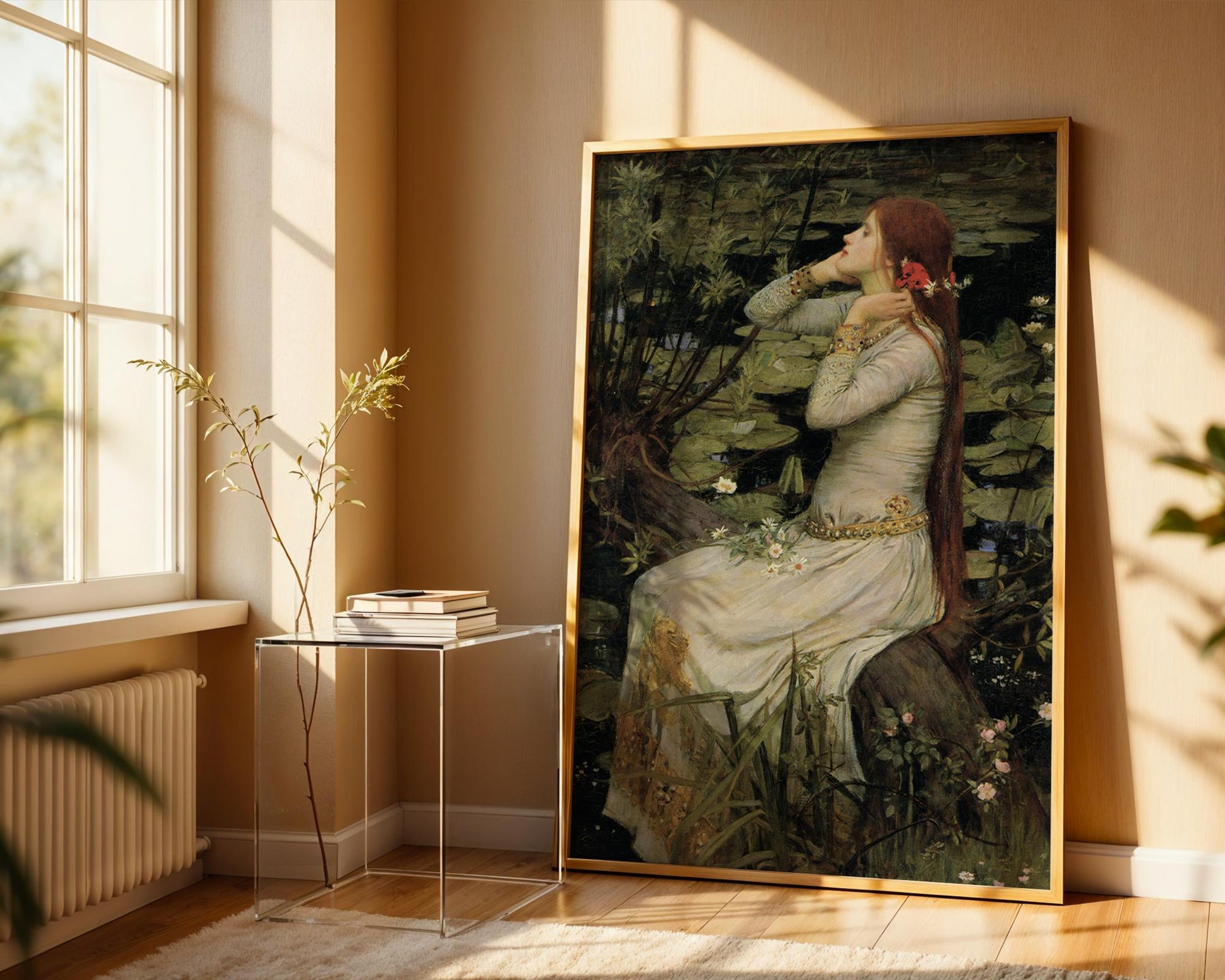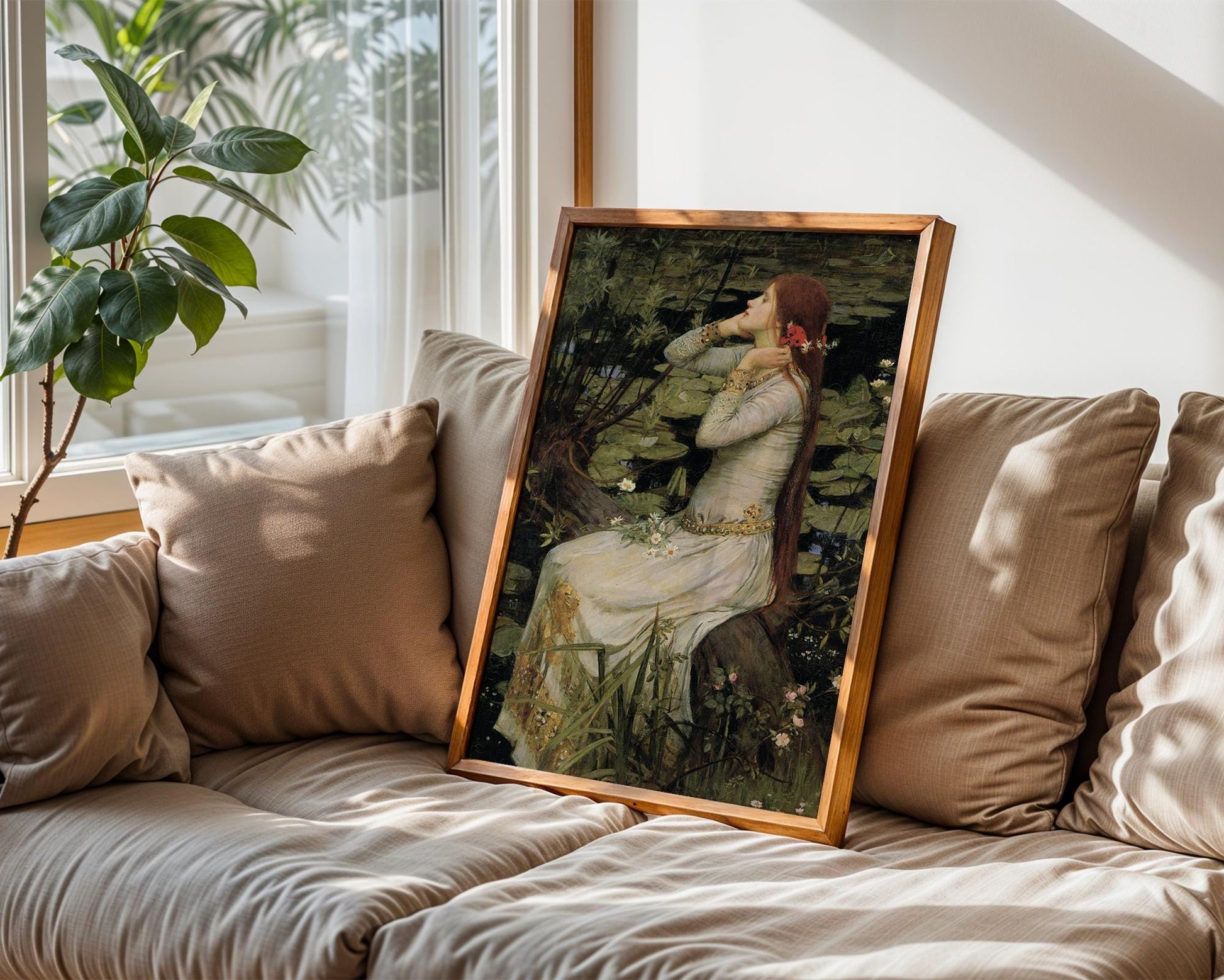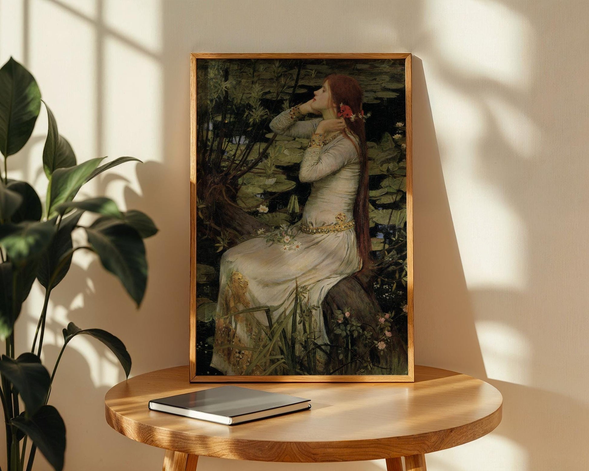 Step into a world of beauty, tragedy, and timeless storytelling with this hauntingly beautiful reproduction of Ophelia by master Pre-Raphaelite painter John William Waterhouse. Inspired by Shakespeare's Hamlet, this artwork captures Ophelia in a moment of tender sorrow and introspection, surrounded by nature's quiet elegance and her own unraveling fate.