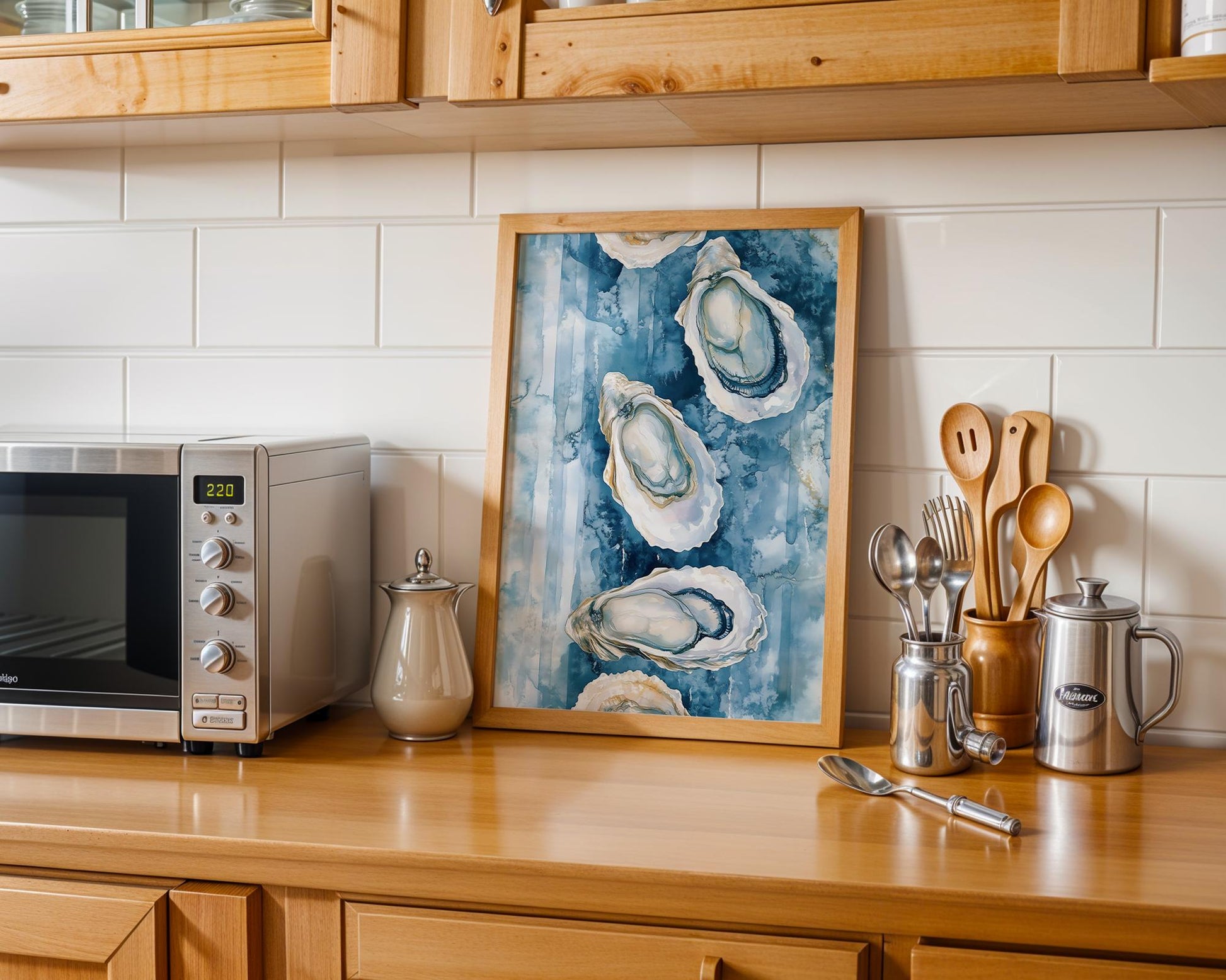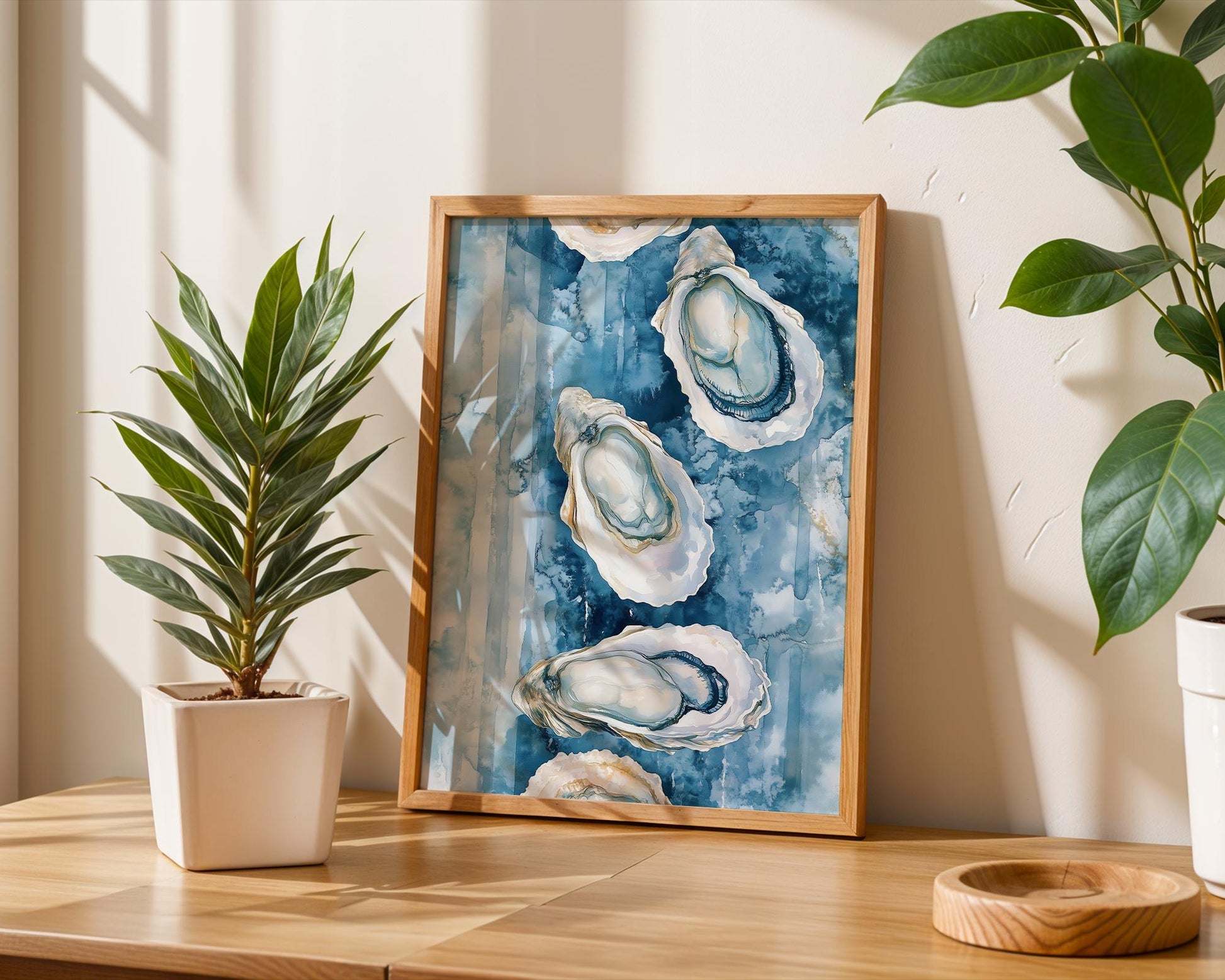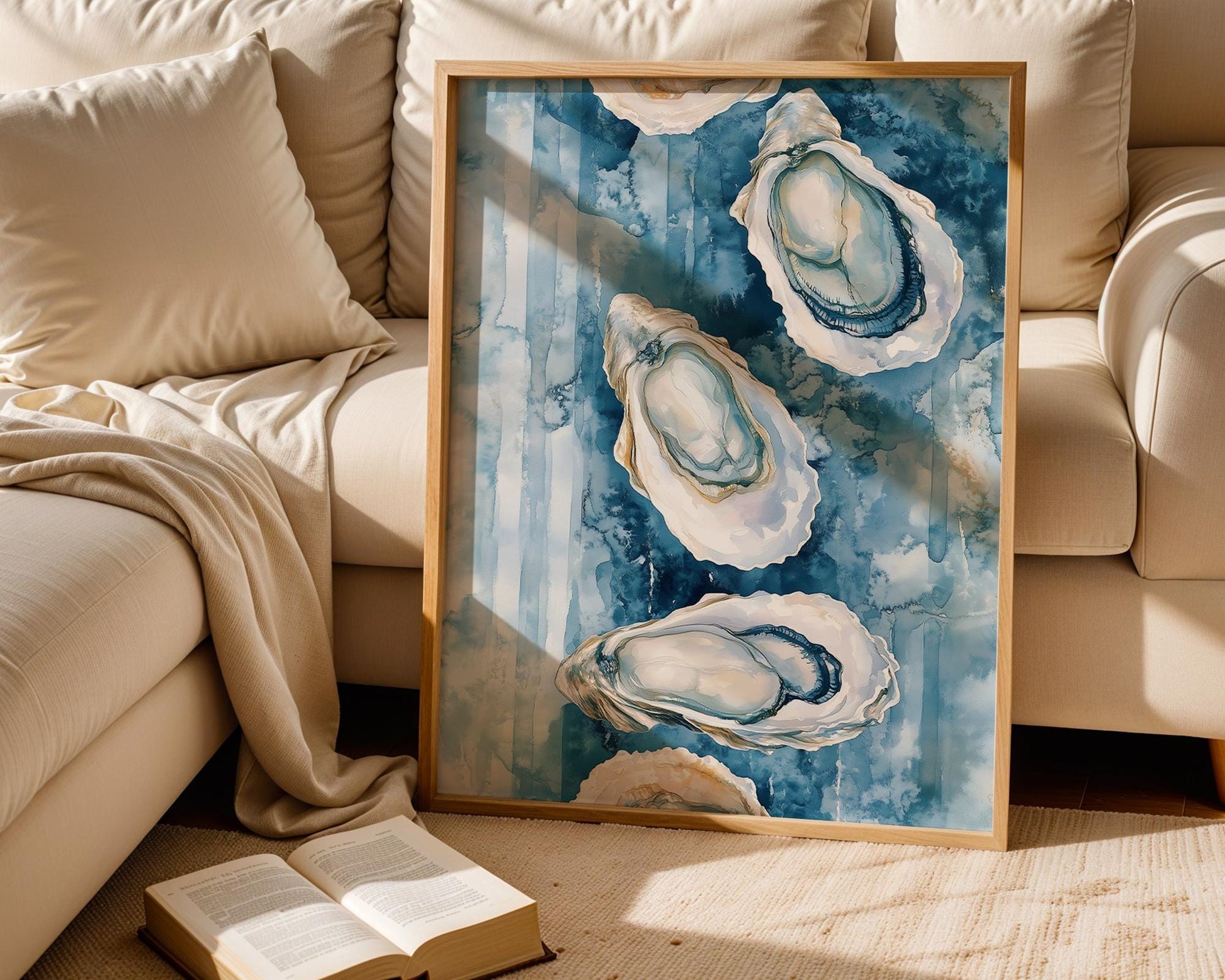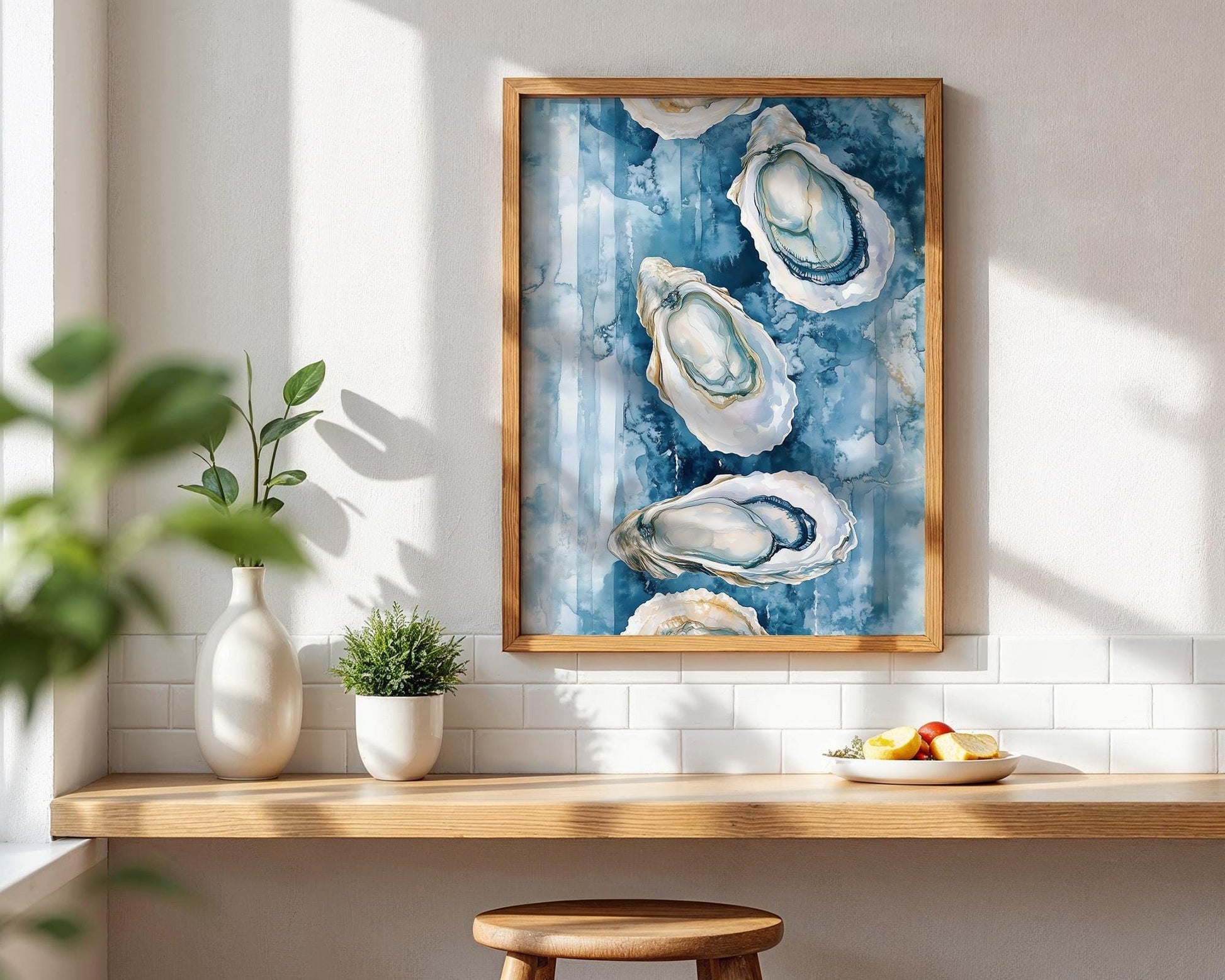 Add a touch of coastal charm to your home with this stunning Oyster Watercolor Wall Art. Perfect for nautical kitchen decor or beach house artwork, this blue sea shell print brings the beauty of the ocean into any space. Illustrated with precision, this ocean shellfish painting is a standout piece that will captivate all who see it.