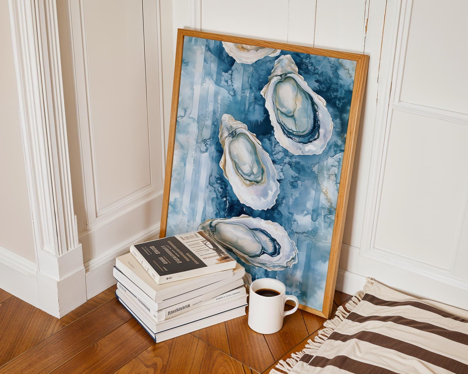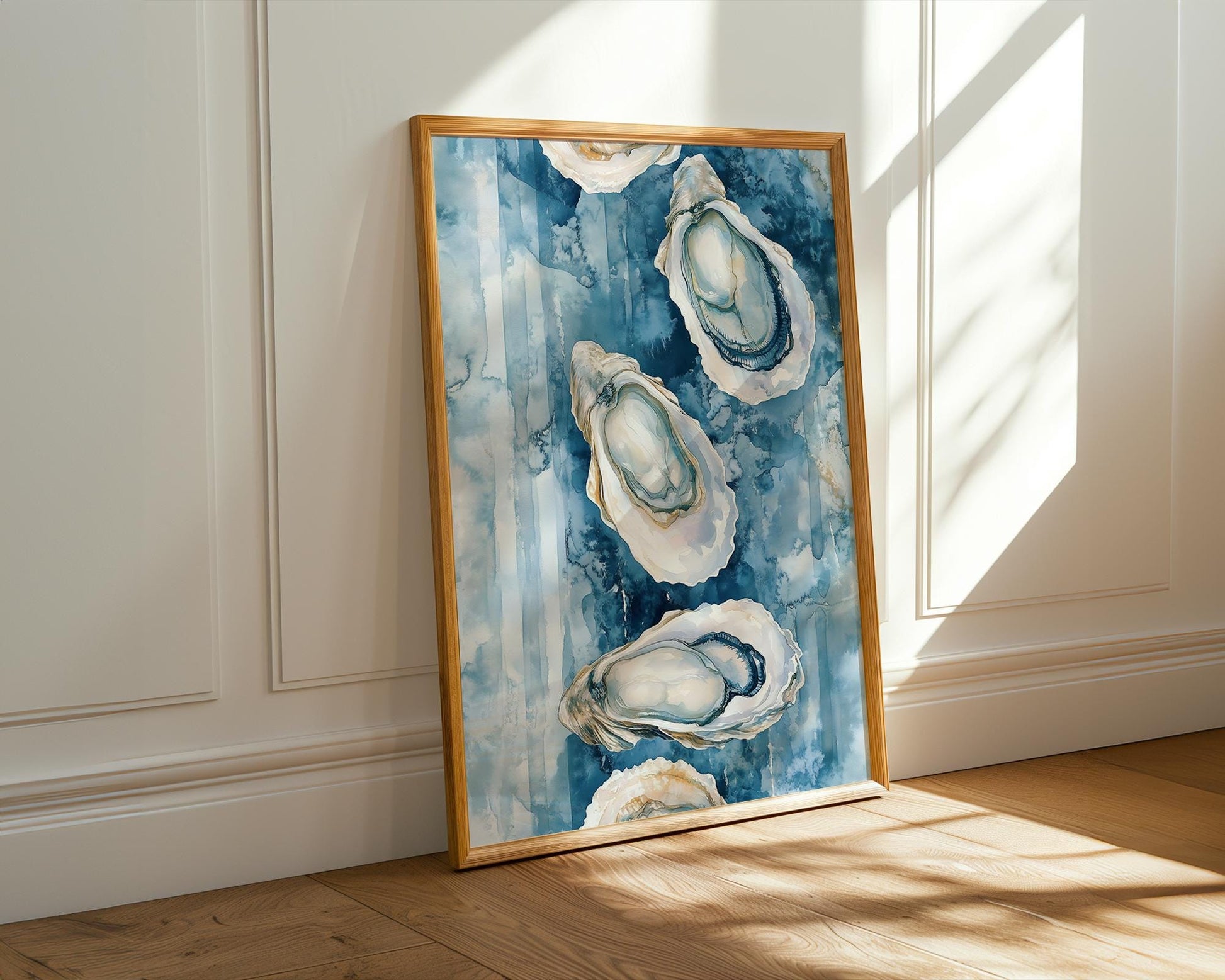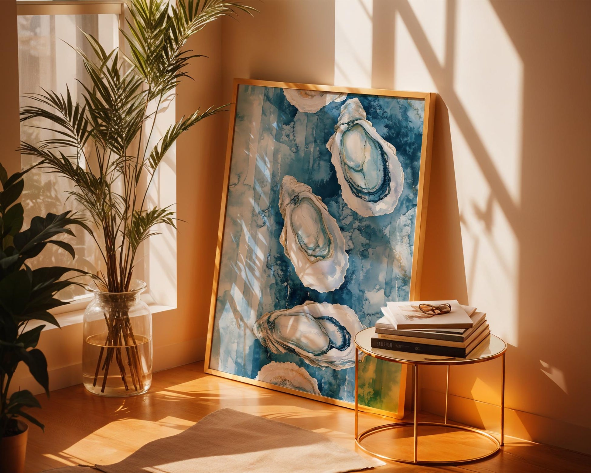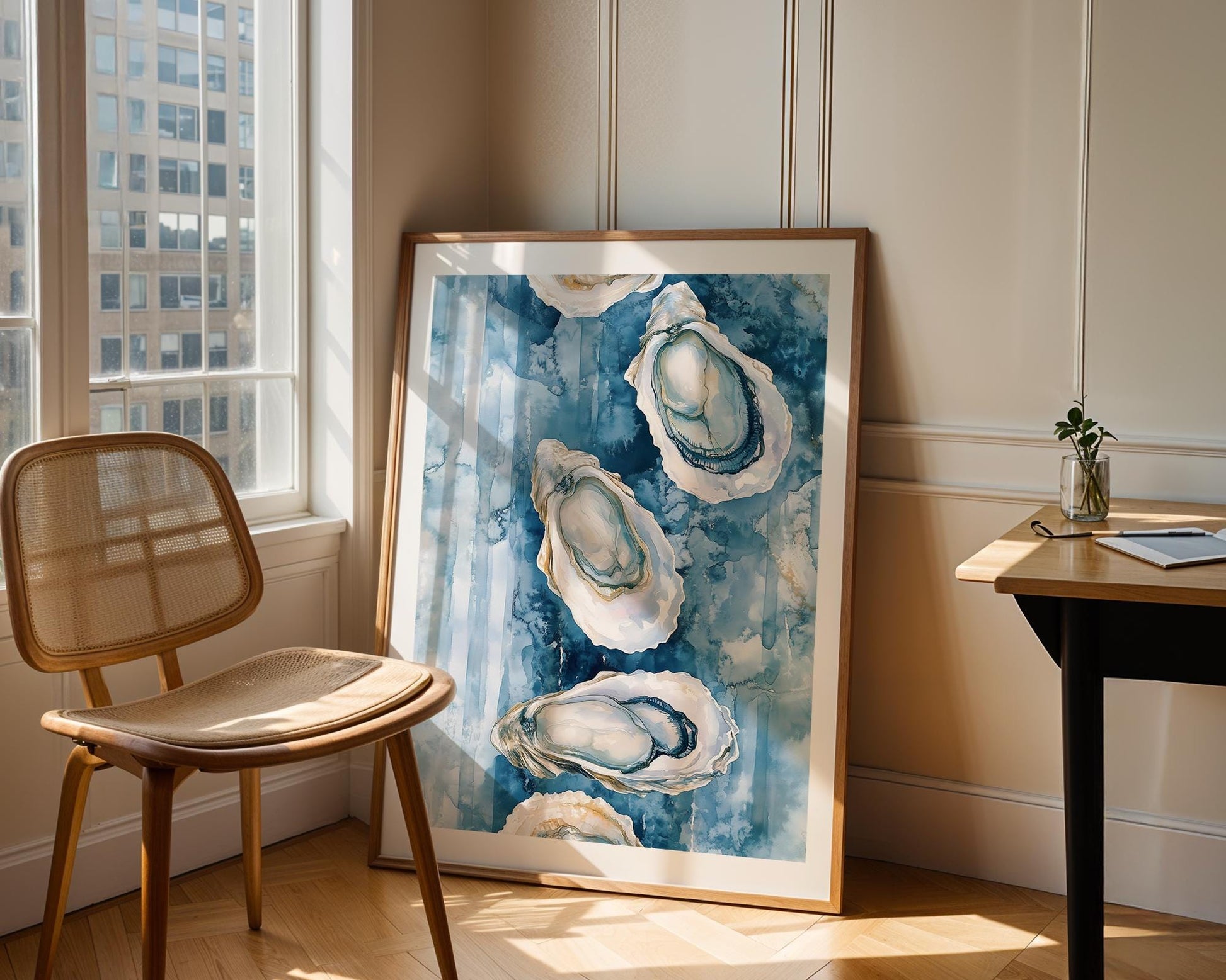 Add a touch of coastal charm to your home with this stunning Oyster Watercolor Wall Art. Perfect for nautical kitchen decor or beach house artwork, this blue sea shell print brings the beauty of the ocean into any space. Illustrated with precision, this ocean shellfish painting is a standout piece that will captivate all who see it.