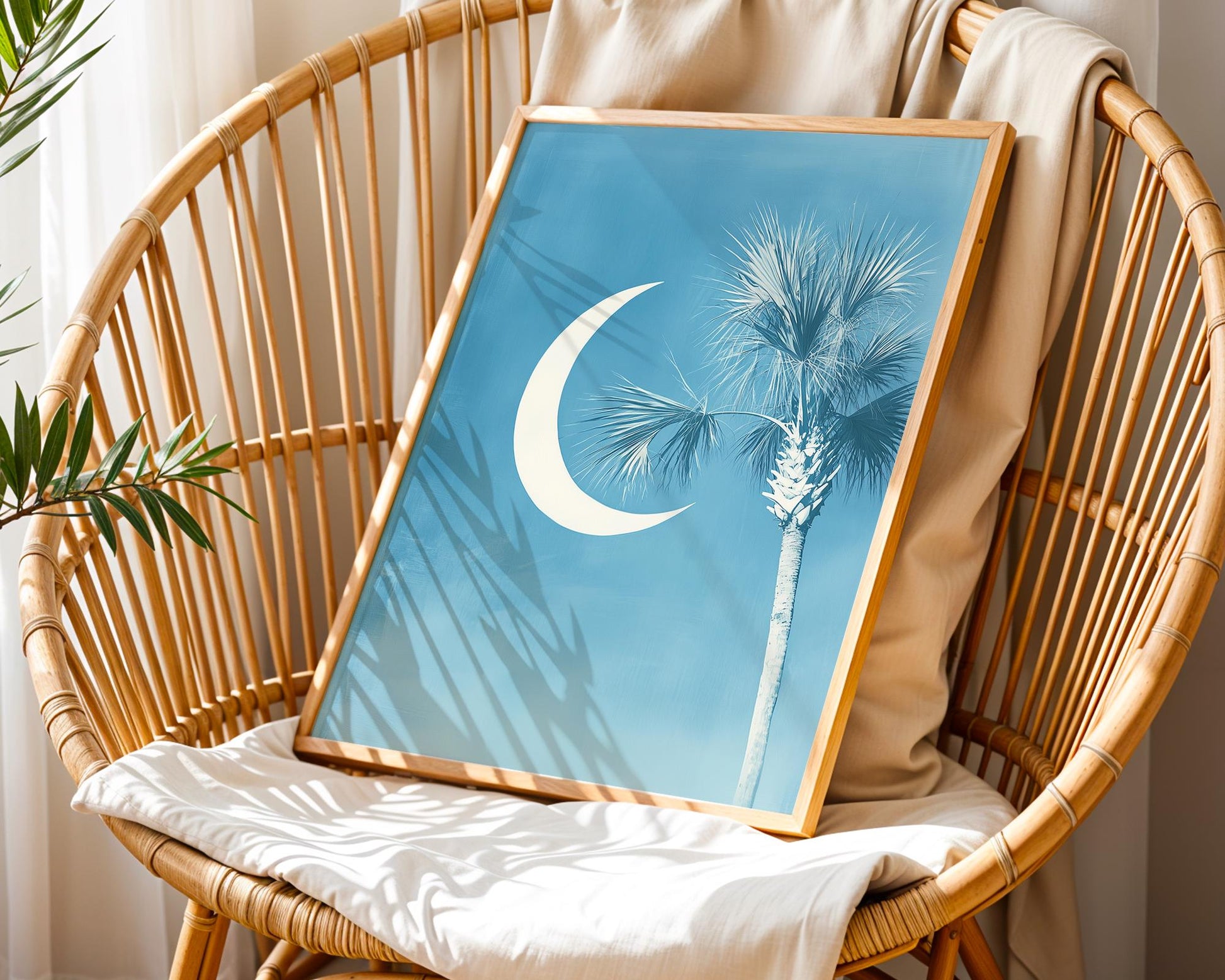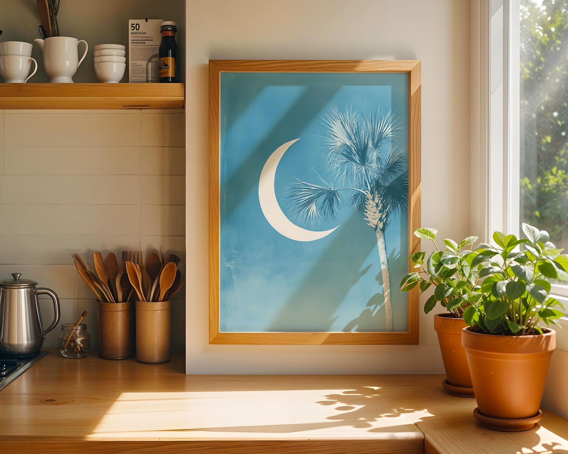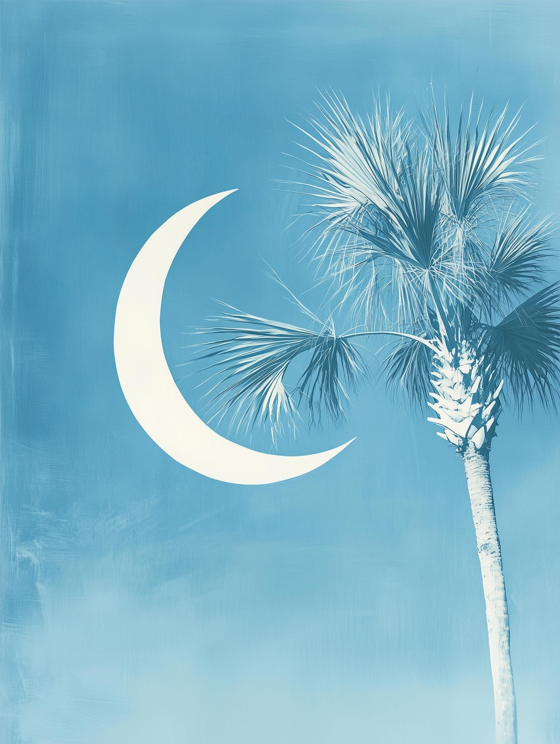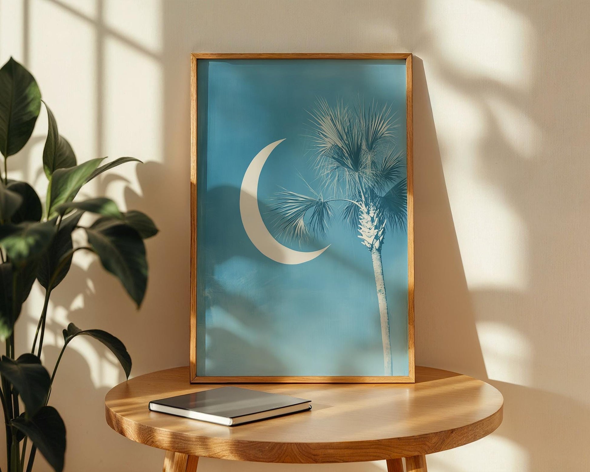 South Carolina Flag Art Print – Minimalist Crescent Moon & Palmetto Wall Decor, Coastal Southern Home Artwork, Blue Palm Tree Poster