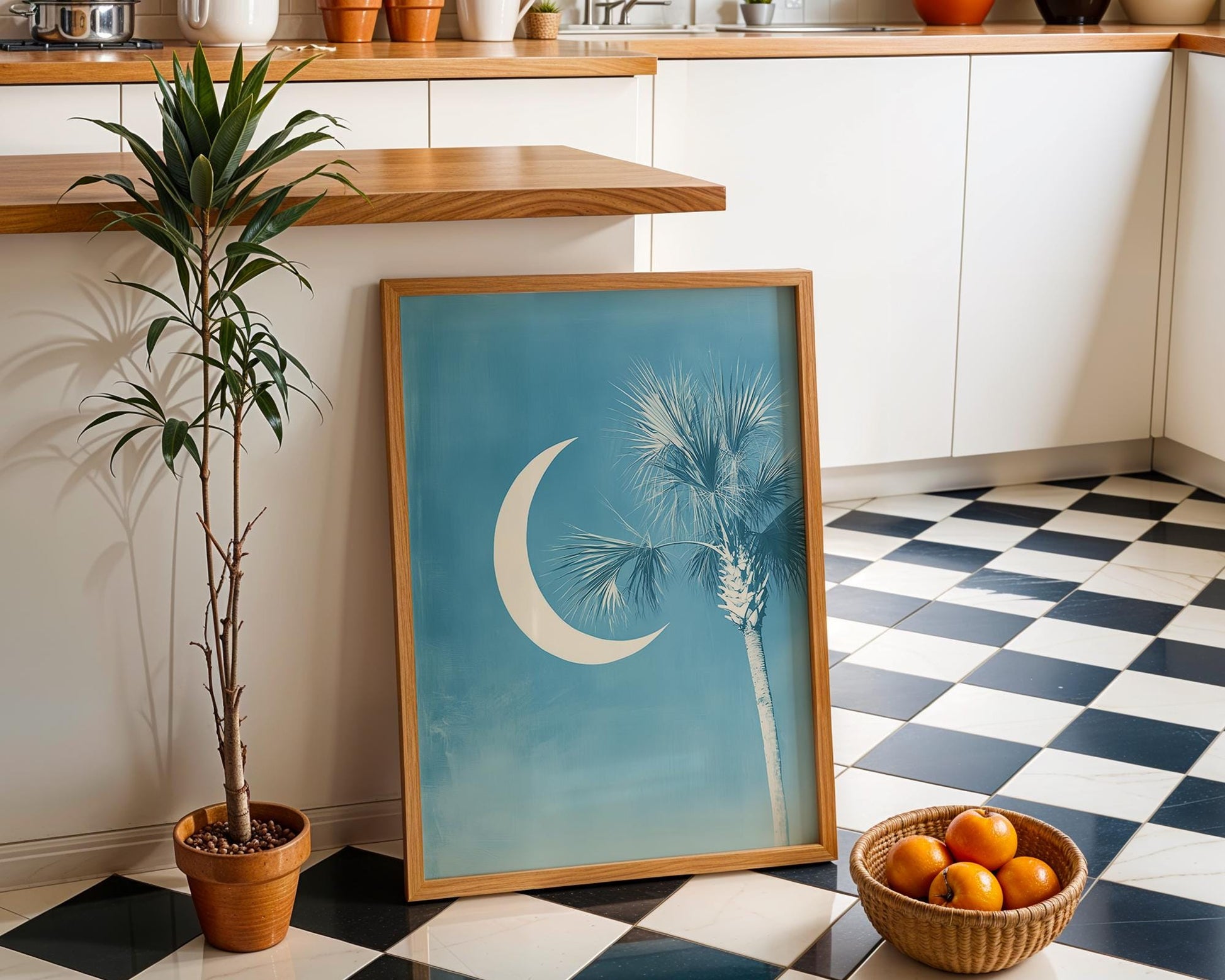 🌙 Bring a serene Southern charm to your space with this minimalist art print inspired by the South Carolina flag. Featuring a bold white crescent moon and palmetto tree against a soft coastal blue background, this piece blends state pride, modern design, and beachside tranquility.